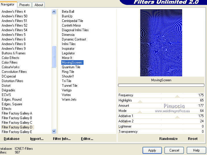 Effetti>Plugins>Filters Unlimited - Filter Factory Gallery D - Moving Screen, con i settaggi standard.