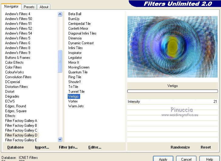 Effetti>Plugins>Filters Unlimited - Filter Factory Gallery D - Vertigo, con i settaggi standard.