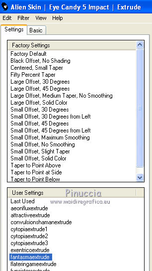 Metti il preset fantasmaextrude nella cartella del filtro Alien Skin Eye Candy 5 Impact>Settings>Extrude. Doppio clic sul file e il preset sarà automaticamente installato.