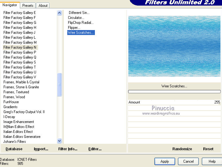 Effetti>Plugins>Filters Unlimited - Filter Factory Gallery N - Wee Scratches, con i settaggi standard.