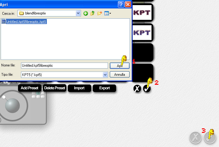 Clicca su Import, seleziona il preset untitled.kpt4fibreoptic.kpt5 e apri (1).
