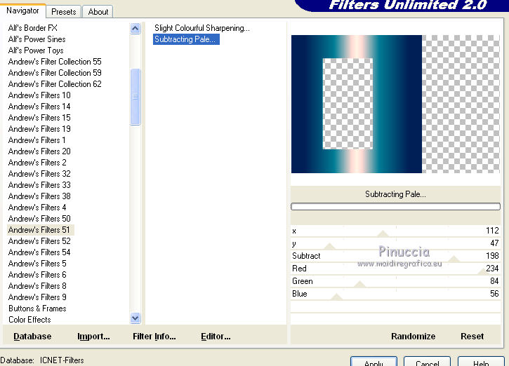 Effetti>Plugins>Filters Unlimited - Andrew's Filter 51 - Subracting Pale, con i settaggi standard.