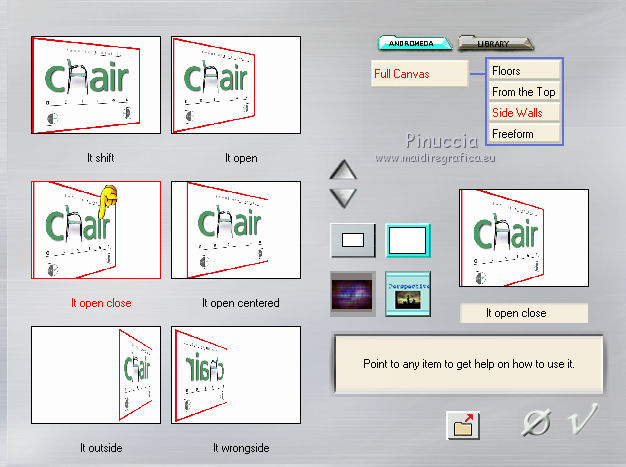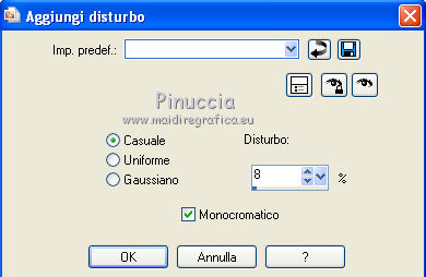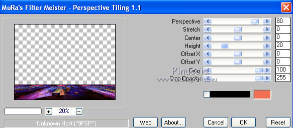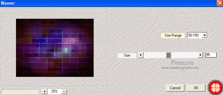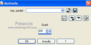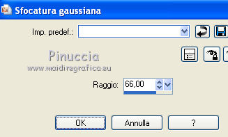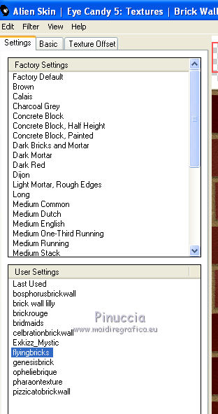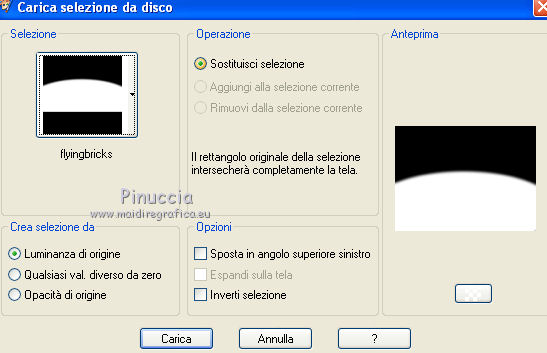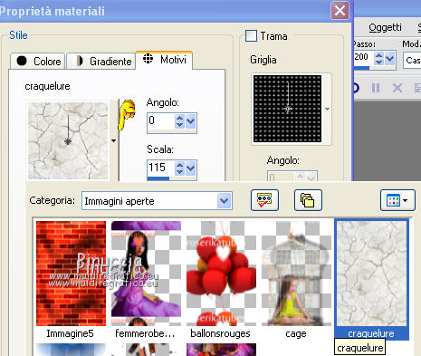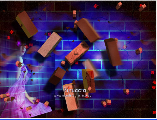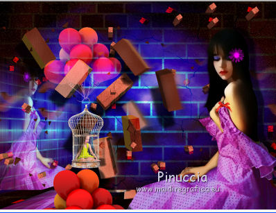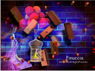 Occorrente: Materiale qui Il materiale fa parte della collezione personale di Roserika. Per favore, lascia intatto il copyright. Filtri: Se hai problemi con i filtri, ricordati della mia sezione filtri qui Andromeda - Perspective qui Alien Skin Eye Candy 5 Texture qui Graphics Plus qui Mura's Meister - Perspective Tiling qui Mehdi qui Metti il preset "flyingbricksbricks" nella cartella del filtro Alien Skin Eye Candy 5 Textures>Settings>BrickWall. Doppio clic sul file e il preset sarà automaticamente installato. Se preferisci puoi importarlo, quando ti servirà, dalla cartella in cui hai scompattato il materiale. Vedi la scheda del filtro qui e come importare un preset in Eye Candy qui Metti la maschera nella cartella Maschere. Metti la selezione nella cartella Selezioni. Apri la trama "craquelure" in PSP e minimizzala con il resto del materiale. 1. Apri una nuova immagine trasparente 1000 x 750 pixels. Imposta il colore di primo piano con il colore nero, e il colore di sfondo con #f36f53. Effetti>Plugins>Alien Skin Eye Candy 5 Textures - Brick Wall. Seleziona il preset flyingbrick e ok. ![]() Regola>Luminosità e contrasto>Nitidezza. ![]() Livelli>Nuovo livello raster. Riempi con il colore di sfondo.Livelli>Carica/Salva maschera>Carica maschera da disco. Cerca e carica la maschera 20-20, con i seguenti settaggi. ![]() Livelli>Unisci>Unisci gruppo. Cambia la modalità di miscelatura di questo livello in Sovrapponi. Livelli>Unisci>Unisci visibile. Effetti>Plugins>Graphics Plus - Cross Shadow, con i settaggi standard. ![]() 2. Se non l'hai fatto prima di cominciare, apri la trama "craquelure" e minimizzala. Passa il colore di primo piano a Motivi, e seleziona la trama nella lista delle immagini aperte, con i seguenti settaggi. ![]() Livelli>Nuovo livello raster. Riempi con il motivo craquelure.Cambia la modalità di miscelatura di questo livello in Moltiplica. Livelli>Nuovo livello raster. Riempi con il colore nero.Livelli>Carica/Salva maschera>Carica maschera da disco. Carica nuovamente la maschera 20-20, con i settaggi precedenti. ![]() Livelli>Unisci>Unisci gruppo. Abbassa l'opacità di questo livello all'85%. Regola>Aggiungi/rimuovi disturbo>Aggiungi disturbo. ![]() Livelli>Unisci>Unisci visibile. Apri il tube "formebleue" e vai a Modifica>Copia. non chiuderlo perchè ti servirà ancora. Torna al tuo lavoro e vai a Modifica>Incolla come nuovo livello. Lascialo come sta. Cambia la modalità di miscelatura di questo livello in Luce netta, e abbassa l'opacità al 79%. Livelli>Unisci>Unisci visibile. 3. Livelli>Duplica. Effetti>Plugins>Mehdi - Weaver. ![]() Effetti>Plugins>Andromeda - Perspective clicca sull'icona Presets ![]() e imposta i seguenti settaggi. ![]() Immagine>Ridimensiona, all'80%, tutti i livelli non selezionato. Effetti>Effetti di immagine>Scostamento. ![]() 4. Selezione>Seleziona tutto. Selezione>Mobile. Selezione>Immobilizza. Livelli>Nuovo livello raster. Apri il tube "femmeroberose" e vai a Modifica>Copia. non chiuderlo perchè ti servirà ancora. Torna al tuo lavoro e vai a Modifica>Incolla nella selezione. Selezione>Deseleziona. Cambia la modalità di miscelatura di questo livello in Filtra. Attiva nuovamente il tube "formebleue" e vai a Modifica>Copia. Torna al tuo lavoro e vai a Modifica>Incolla come nuovo livello. Lascialo come sta. Cambia la modalità di miscelatura di questo livello in Luce netta, e abbassa l'opacità al 79%. Apri il tube "bricks", attiva il livello Raster 1 e vai a Modifica>Copia. Torna al tuo lavoro e vai a Modifica>Incolla come nuovo livello. Lascialo come sta. Cambia la modalità di miscelatura di questo livello in Luce netta. Copia il livello Raster 3 del tube "bricks" e vai a Modifica>Copia. Torna al tuo lavoro e vai a Modifica>Incolla come nuovo livello. Lascialo come sta. Cambia la modalità di miscelatura di questo livello in Sovrapponi. per il mio esempio ho lasciato la modalità Normale ![]() 5. Apri il tube "ballonsrouges" e vai a Modifica>Copia. non chiuderlo perchè ti servirà ancora. Torna al tuo lavoro e vai a Modifica>Incolla come nuovo livello. Spostalo in alto a sinistra, come nel mio esempio.Cambia la modalità di miscelatura di questo livello in Filtra. Apri il tube "cage" e vai a Modifica>Copia. non chiuderlo perchè ti servirà ancora. Torna al tuo lavoro e vai a Modifica>Incolla come nuovo livello. Spostalo sotto la gabbia![]() Livelli>Unisci>Unisci visibile. Livelli>Duplica. Immagine>Ridimensiona, all'85%, tutti i livelli non selezionato. Effetti>Effetti di immagine>Scostamento. ![]() Attiva il livello sottostante. Livelli>Duplica. Effetti>Plugins>Mura's Meister - Perspective Tiling, clicca su Reset per avere i settaggi standard e imposta Height a 20. ![]() 6. Attiva nuovamente il tube "femmeroberose" e vai a Modifica>Copia. Torna al tuo lavoro e vai a Modifica>Incolla come nuovo livello. Immagine>Rifletti. Spostalo in basso a destra.Effetti>Effetti 3D>Sfalsa ombra, con il colore nero. ![]() Attiva ancora il tube "ballonsrouges" e vai a Modifica>Copia. Torna al tuo lavoro e vai a Modifica>Incolla come nuovo livello. Spostalo in basso a sinistra.![]() Effetti>Effetti 3D>Sfalsa ombra, con i settaggi precedenti. Livelli>Unisci>Unisci visibile. Livelli>Nuovo livello raster. Riempi con il colore di sfondo.Livelli>Carica/Salva maschera>Carica maschera da disco. Carica ancora la maschera 20-20, con gli stessi settaggi. ![]() Livelli>Unisci>Unisci gruppo. Selezione>Carica/Salva selezione>Carica selezione da disco. Cerca e carica la selezione flyingbricks. ![]() Premi sulla tastiera il tasto CANC. Selezione>Deseleziona. Effetti>Effetti di distorsione>Mulinello. ![]() Regola>Sfocatura>Sfocatura gaussiana - raggio 66. ![]() Cambia la modalità di miscelatura di questo livello in Sovrapponi. 7. Immagine>Aggiungi bordatura - 20 pixels, simmetriche, con il colore nero. Firma il tuo lavoro ed esporta come jpg ottimizzata, compressione 20. ![]() ![]() Se hai problemi o dubbi, o trovi un link non funzionante, o anche soltanto per un salu