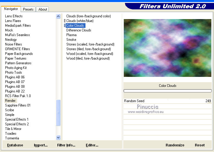 Effetti>Plugins>Filters Unlimited 2.0 - Render - Color Clouds con i settaggi standard.