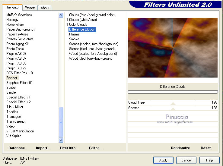 Effetti>Plugins>Filters Unlimited - Render - Difference clouds, con i settaggi standard.