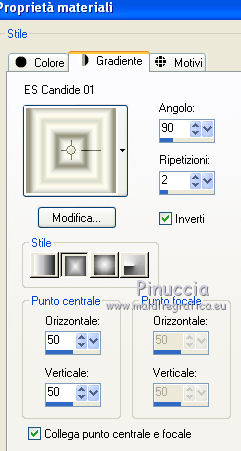 Passa il colore di primo piano a Gradiente, e seleziona il gradiente ES Candide01, con i seguenti settaggi.