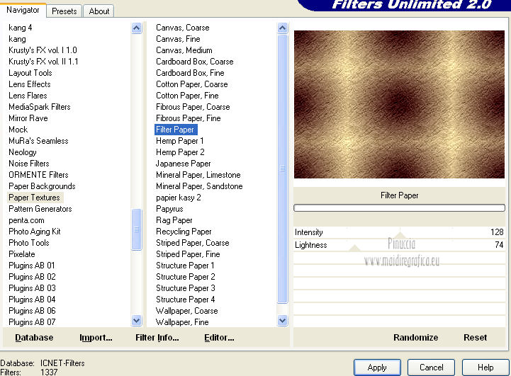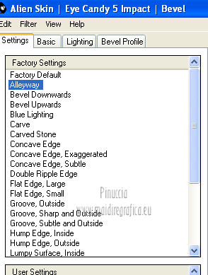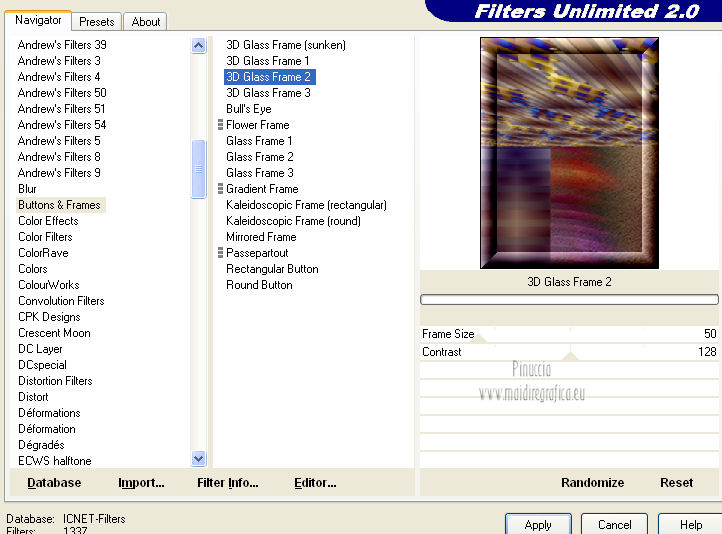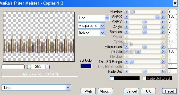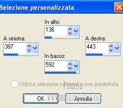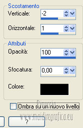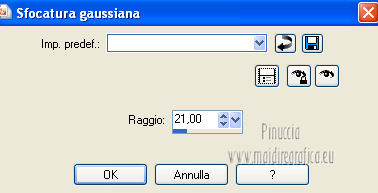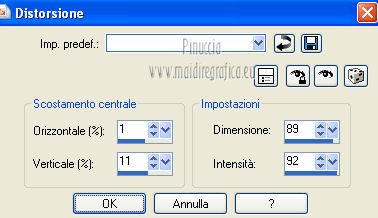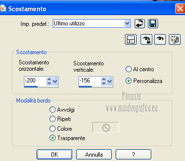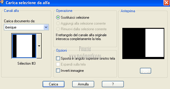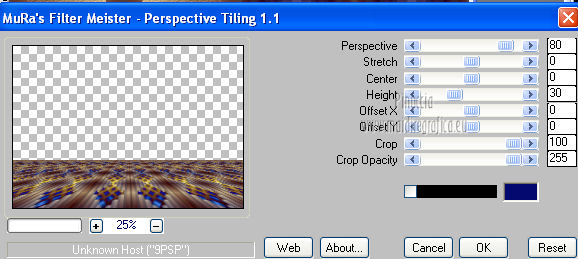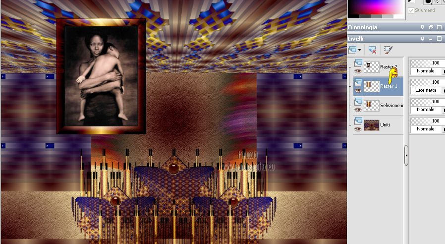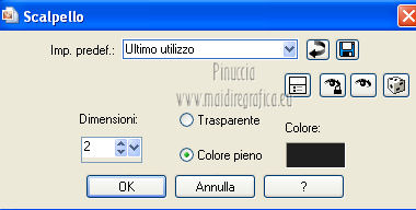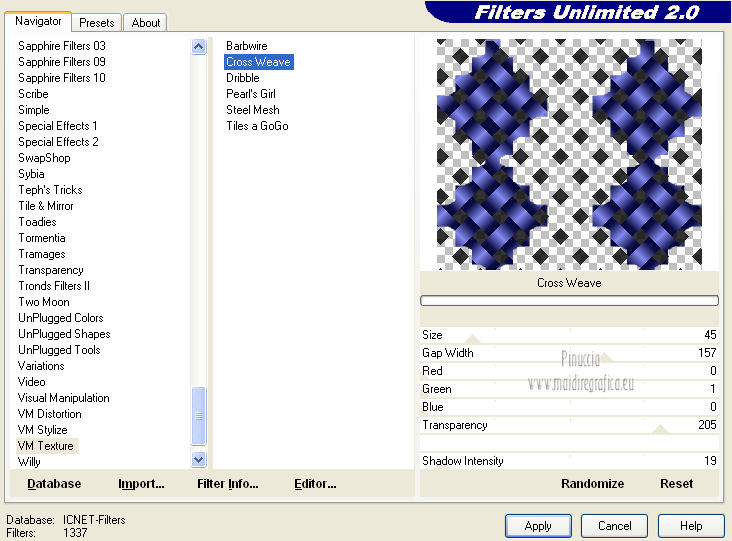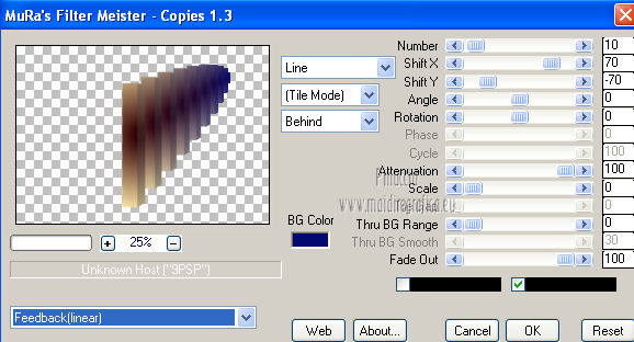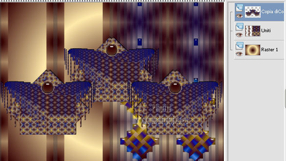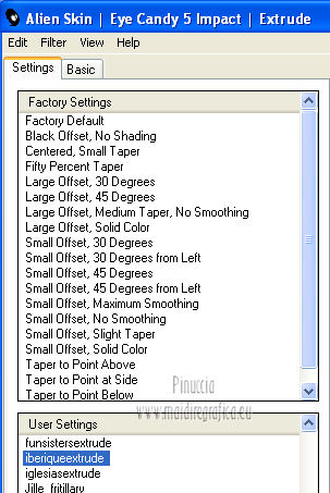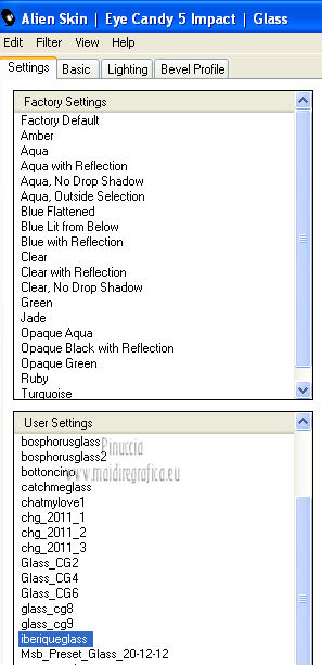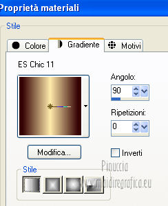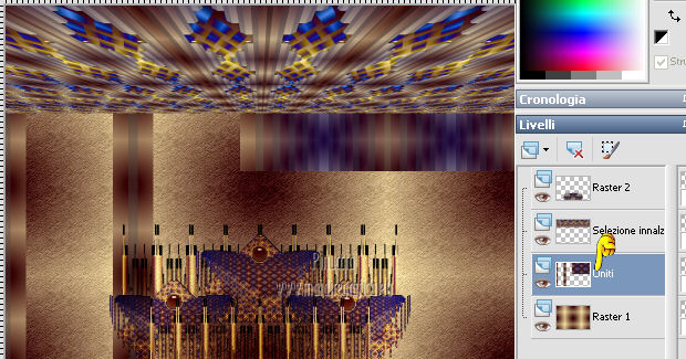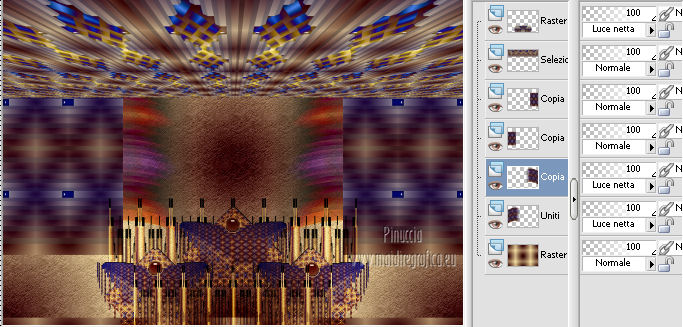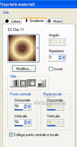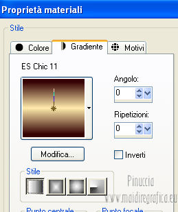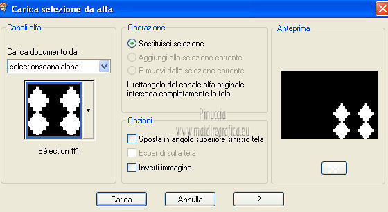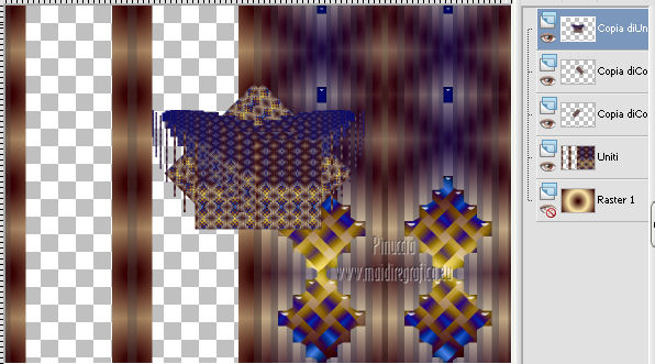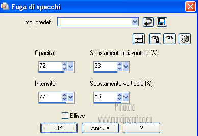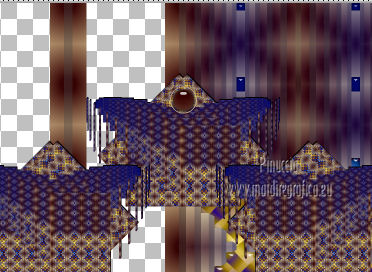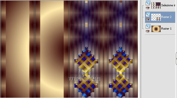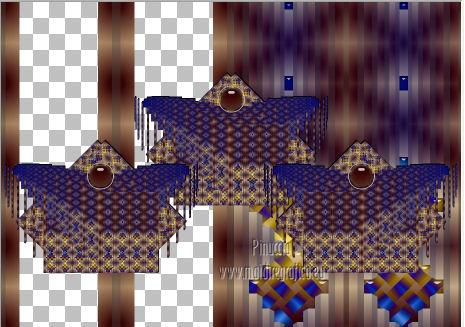 Occorrente: Materiale qui Filtri: Se hai problemi con i filtri, ricordati della mia sezione filtri qui Flaming Pear - Flood qui Mura's Meister - Copies qui Mura's Meister - Perspective Tiling qui Filters Unlimited 2.0 qui VM Texture qui Alien Skin Eye Candy 5 Impact qui Simple qui Metti i preset nella cartella del filtro Alien Skin Eye Candy 5 Impact>Settings>Glass/Extrude. Cliccando sul file una o due volte (a seconda delle tue impostazioni), automaticamente il preset si installerà nella cartella corretta. perchè uno o due clic vedi qui Metti il gradiente nella cartella Gradienti. 1. Passa il colore di primo piano a Gradiente, e seleziona il gradiente ES Chic 11 con i seguenti settaggi. ![]() Imposta il colore di sfondo con #040970. Apri "selectionscanalalpha". Duplica l'immagine usando la combinazione di tasti maiuscola+D e chiudi l'originale. La copia - che ha la dimensione di 920 x 650 pixels - sarà la base del tuo lavoro. L'immagine non è vuota, ma contiene le selezioni salvate sul canale alfa. Riempi l'immagine trasparente con il gradiente.Attiva lo strumento Selezione ,clicca sull'icona Selezione personalizzata ![]() e imposta i seguenti settaggi: ![]() Selezione>Innalza selezione a livello. Effetti>Plugins>Alien Skin Eye Candy 5 Impact - Extrude. Seleziona il preset iberiqueextrude e ok. ![]() Selezione>Deseleziona. non preoccuparti se non vedi bene il risultato dell'effetto, perchè è coperto dal gradiente del livello inferiore. Infatti, se chiudi il livello inferiore, vedi questo. ![]() Effetti>Plugins>Mura's Meister - Copies. ![]() Effetti>Plugins>Simple - Centre Tile. Effetti>Plugins>Simple - Zoom out and flip. 2. Livelli>Nuovo livello raster. Selezione>Carica/Salva selezione>Carica selezione da canale alfa. La selezione "selection1" è subito disponibile. Devi soltanto cliccare Carica. ![]() Selezione>Modifica>Espandi - 1 pixel. Cambia i settaggi del Gradiente in gradiente lineare. ![]() Riempi con il colore gradiente.Livelli>Nuovo livello raster. Riempi con il colore di sfondo.Effetti>Plugins>Filters Unlimited 2.0 - VM Texture - Cross Weaves. ![]() Selezione>Deseleziona. Cambia la modalità di miscelatura di questo livello in Differenza. Livelli>Unisci>Unisci giù. Livelli>Disponi>Sposta giù. Effetti>Plugins>Alien Skin Eye Candy 5 Impact - Glass. Seleziona il preset iberiqueglass e ok. ![]() 3. Rimani su questo livello. ![]() Livelli>Nuovo livello raster. Selezione>Carica/Salva selezione>Carica selezione da canale alfa. Apri il menu delle selezioni e carica "selection#2". ![]() Selezione>Modifica>Espandi - 1 pixel. Riempi con il colore di sfondo.Effetti>Plugins>Alien Skin Eye Candy 5 Impact - Glass, con i settaggi precedenti. Selezione>Deseleziona. Rimanendo posizionato su questo livello, chiudi il livello inferiore. ![]() Livelli>Unisci>Unisci visibile. Livelli>Duplica. Immagine>Rifletti. Selezione>Carica/Salva selezione>Carica selezione da canale alfa. Apri il menu delle selezioni e carica "selection#3". ![]() Premi sulla tastiera il tasto CANC. Selezione>Deseleziona. Effetti>Plugins>Simple - Zoom out and flip. Immagine>Ridimensiona, al 50%, tutti i livelli non selezionato. Effetti>Plugins>Mura's Meister - Copies, con i settaggi precedenti. Immagine>Ridimensiona, al 50%, tutti i livelli non selezionato. Livelli>Duplica. Immagine>Rifletti. Livelli>Unisci>Unisci giù. 4. Livelli>Duplica. Immagine>Ruota per gradi - 45 gradi a destra. ![]() Immagine>Capovolgi. Selezione>Carica/Salva selezione>Carica selezione da canale alfa. Apri il menu delle selezioni e carica "selection#4". Selezione>Inverti. Premi sulla tastiera il tasto CANC. Selezione>Deseleziona. Livelli>Disponi>Sposta giù. Effetti>Effetti di immagine>Scostamento. ![]() Livelli>Duplica. Immagine>Rifletti. Attiva il livello superiore. ![]() Livelli>Unisci>Unisci giù - 2 volte. Effetti>Effetti 3D>Sfalsa ombra, con il colore nero. ![]() Livelli>Duplica. Effetti>Effetti di immagine>Scostamento. ![]() Livelli>Duplica. Immagine>Rifletti. Livelli>Unisci>Unisci giù - 2 volte. 5. Livelli>Nuovo livello raster. Selezione>Carica/Salva selezione>Carica selezione da canale alfa. Apri il menu delle selezioni e carica "selection#5". Riporta il Gradiente a stile Sprazzo di luce. ![]() Riempi la selezione con il gradiente.Selezione>Modifica>Contrai - 2 pixels. Premi sulla tastiera il tasto CANC. Selezione>Modifica>Contrai - 3 pixels. Livelli>Nuovo livello raster. Riempi con il gradiente.Effetti>Effetti di distorsione>Distorsione. ![]() Selezione>Deseleziona. Effetti>Plugins>Alien Skin Eye Candy 5 Impact - Glass, con i settaggi precedenti. Livelli>Disponi>Sposta giù. Attiva nuovamente il livello soprastante. Regola>Messa a fuoco>Metti a fuoco. Livelli>Unisci>Unisci giù. Sposta il livello un po' più in basso![]() Livelli>Duplica. Sposta questa immagine a sinistra.Livelli>Duplica. Sposta l'immagine a destra.![]() Livelli>Unisci>Unisci giù e ripeti 2 volte. 6. Riapri il livello inferiore e questa dovrebbe essere la tua paletta dei livelli. ![]() 7. Livelli>Nuovo livello raster. Selezione>Carica/Salva selezione>Carica selezione da canale alfa. Apri il menu delle selezioni e carica "selection#6". Cambia nuovamente i settaggi del gradiente. ![]() Riempi la selezione con il gradiente.Selezione>Deseleziona. Effetti>Plugins>Alien Skin Eye Candy 5 Impact - Bevel, seleziona il preset Alleways e ok. ![]() Effetti>Effetti di riflesso>Fuga di specchi. ![]() Livelli>Duplica. Immagine>Rifletti. Livelli>Unisci>Unisci giù. Effetti>Plugins>Mura's Meister - Copies. ![]() Livelli>Disponi>Sposta giù. Effetti>Effetti di immagine>Scostamento. ![]() Immagine>Ridimensiona, al 90%, tutti i livelli non selezionato. Effetti>Effetti 3D>Sfalsa ombra, con il colore nero. ![]() 8. Livelli>Duplica. Immagine>Ridimensiona, all'80%, tutti i livelli non selezionato. Livelli>Disponi>Porta in alto. Effetti>Effetti di immagine>Scostamento. ![]() Livelli>Unisci>Unisci giù 2 volte e avrai i tre livelli in un unico livello. Immagine>Ridimensiona, al 60%, tutti i li