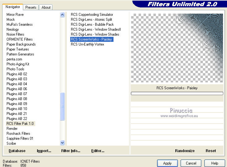 Effetti>Plugins>Filters Unlimited 2.0 - RCS Filter Pak 1.0 - RCS ScreenWorks-Paisley