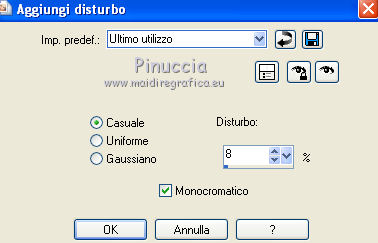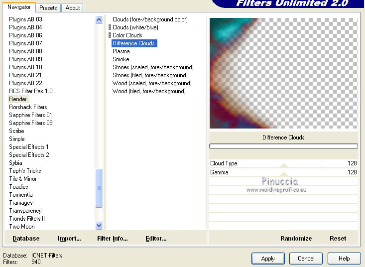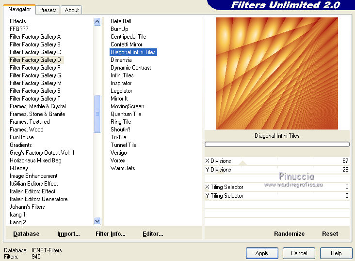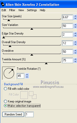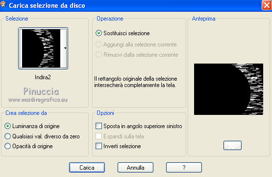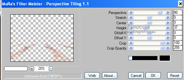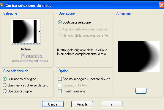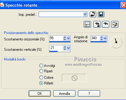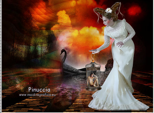 Occorrente: Materiale qui Il materiale fa parte della collezione personale di Roserika. Per favore, lascia intatto il copyright. Filtri: Se hai problemi con i filtri, ricordati della mia sezione filtri qui Alien Skin Xenofex 2.0 - Constellation qui Mura's Meister - Perspective Tiling qui Filters Unlimited qui Filter Factory Gallery D qui Metti il gradiente nella cartella Gradienti. Metti le selezioni nella cartella Selezioni. 1. Passa il colore di primo piano a Gradiente e seleziona il gradiente ES Vintage 02, con i seguenti settaggi. ![]() Imposta il colore di sfondo con il colore nero #000000. Apri una nuova immagine trasparente 1000 x 750 pixels, e riempila con il gradiente.Selezione>Carica/Salva selezione>Carica selezione disco. Cerca e carica la selezione indira. ![]() Senza creare un nuovo livello: Effetti>Plugins>Filters Unlimited 2.0 - Filters Factory Gallery D - Diagonal Infini Tiles, con i settaggi standard. ![]() Effetti>Effetti di distorsione>Mulinello. ![]() Selezione>Deseleziona. Effetti>Effetti di riflesso>Specchio rotante. ![]() 2. Selezione>Seleziona tutto. Livelli>Nuovo livello raster. Apri l'immagine "paysage" e vai a Modifica>Copia. Torna al tuo lavoro e vai a Modifica>Incolla nella selezione. Selezione>Deseleziona. Immagine>Rifletti. Cambia la modalità di miscelatura di questo livello in Luce netta. Attiva nuovamente il livello inferiore. Selezione>Carica/Salva selezione>Carica selezione disco. Cerca e carica la selezione indira2. ![]() Selezione>Innalza selezione a livello. Selezione>Deseleziona. Livelli>Disponi>Porta in alto. Effetti>Plugins>Mura's Meister - Perspective Tiling Clicca su Reset per impostare i settaggi standard e cambia height con 37. ![]() 3. Apri il tube "cygnes" e vai a Modifica>Copia. Torna al tuo lavoro e vai a Modifica>Incolla come nuovo livello. Spostalo al centro.Vedi l'esempio finale. Apri il tube "femmecage" e vai a Modifica>Copia. Torna al tuo lavoro e vai a Modifica>Incolla come nuovo livello. Spostalo in basso a destra.![]() Selezione>Carica/Salva selezione>Carica selezione disco. Cerca e carica la selezione indira3. ![]() Livelli>Nuovo livello raster. Riempi con il colore nero.Selezione>Deseleziona. Regola>Sfocatura>Sfocatura gaussiana - raggio 53. ![]() Selezione>Carica/Salva selezione>Carica selezione disco. Cerca e carica la selezione indira4. ![]() Livelli>Nuovo livello raster. Riempi con il gradiente.Selezione>Deseleziona. Cambia la modalità di miscelatura di questo livello in Sovrapponi. Regola>Aggiungi/Rimuovi disturbo>Aggiungi disturbo. ![]() 4. Livelli>Duplica. Immagine>Rifletti. Effetti>Plugins>Filters Unlimited 2.0 - Render - Difference Clouds. ![]() Cambia la modalità di miscelatura di questo livello in Differenza, e abbassa l'opacità al 68%. Attiva il livello sottostante. Livelli>Duplica. Effetti>Plugins>Alien Skin Xenofex 2.0 - Constellation. ![]() Livelli>Disponi>Porta in alto. Immagine>Rifletti. 5. Immagine>Aggiungi bordatura, 20 pixels, simmetriche, con il colore nero. Firma il tuo lavoro ed esporta come jpg ottimizzata, compressione 20. ![]() ![]() Se hai problemi o dubbi, o trovi un link non funzionante, o anche soltanto per un saluto, scrivimi. |