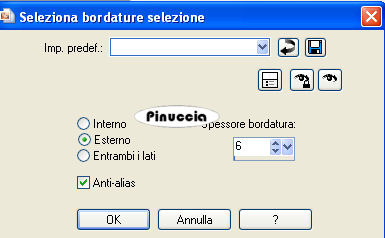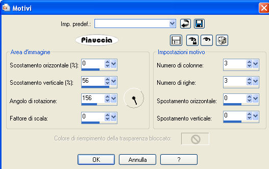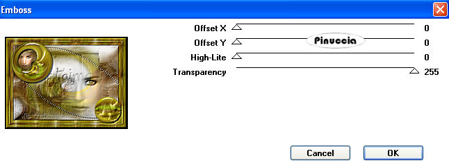 qui puoi trovare qualche risposta ai tuoi dubbi. Se l'argomento che ti interessa non è presente, ti prego di segnalarmelo. Questo tutorial è stato scritto con PSP X, ma può essere eseguito anche con le altre versioni di PSP. Il tube del viso appartiene a Caroline. Per favore non cancellate il copyright. Gli altri tubes scraps sono composizioni personali di Roserika. Occorrente: Materiale qui Filtri: Graphics Plus qui FM Tile Tools qui 1. Apri il file "Fondjaune". Questa sarà la base del tuo lavoro. Modifica>Copia. ti consiglio, tuttavia, di fare una copia di riserva del file (shift+D), nel caso dovessi perderlo dalla memoria. 2. Immagine>Aggiungi bordatura, 50 pixels, simmetriche, con un colore contrastante. Seleziona questo bordo con la bacchetta magica ![]() ![]() Modifica>Incolla nella selezione. Effetti>Effetti di riflesso>motivi. ![]() Selezione>Innalza selezione a livello. Immagine>Rifletti. Selezione>Deseleziona. 3. Cambia la modalità di miscelatura di questo livello in Sovrapponi, e abbassa l'opacità al 74%. ![]() Selezione>Seleziona tutto. Selezione>Modifica>Contrai, di 25 pixels. Selezione>Seleziona bordature selezione. ![]() Modifica>Incolla nella seleziona (l'immagine copiata al punto 1 è ancora in memoria). Effetti>Effetti 3D>Scalpello, 3, colore nero. ![]() Effetti>Effetti 3D>Sfalsa ombra, con i seguenti settaggi, colore nero. ![]() Selezione>Deseleziona. 4. Posizionati sul livello di sfondo. Selezione>Seleziona tutto. Selezione>Modifica>Contrai, di 50 pixels. Effetti>Effetti 3D>Scalpello, con i settaggi precedenti. Effetti>Effetti 3D>Sfalsa ombra, con i settaggi precedenti. Selezione>Deseleziona. 5. Livelli>Unisci>Unisci tutto. Apri l'immagine "Je t'aime" e vai a Modifica>Copia. Torna al tuo lavoro. Attiva lo strumento Selezione ,e traccia una selezione al centro, come nell'esempio. ![]() Livelli>Nuovo livello raster. Modifica>Incolla nella selezione. Cambia la modalità di miscelatura di questo livello in Luce netta, e abbassa l'opacità al 40%. ![]() Selezione>Deseleziona. 6. Apri il tube Demimoore, e vai a Modifica>Copia. non chiuderlo perchè ti servirà ancora. Torna al tuo lavoro e vai a Modifica>Incolla come nuovo livello. Posiziona il tube in basso a destra.Effetti>Plugins>FM Tile Tools Blend Emboss, con i settaggi standard. ![]() Cambia la modalità di miscelatura di questo livello in Luminanza (esistente). 7. Posizionati nuovamente sul livello di sfondo. Effetti>Plugins>FM Tile Tools - Blend Emboss, come al punto precedente. 8. Apri il tube cercleglass. Attiva lo strumento Bacchetta magica ,e seleziona la parte trasparente. Selezione>Modifica>Espandi, di 4 pixels. Attiva nuovamente il tube Demimoore e vai a Modifica>Copia. Torna al tube cercleglass e vai a Modifica>Incolla nella selezione. Selezione>Deseleziona. Modifica>Copia. 9. Torna al tuo lavoro e vai a Modifica>Incolla come nuovo livello. Posiziona il tube in alto a sinistra.Effetti>Effetti 3D>Sfalsa ombra, con i settaggi precedenti. 10. Apri il tube cerclefleur e vai a Modifica>Copia. Torna al tuo lavoro e vai a Modifica>Incolla come nuovo livello. Immagine>Ridimensiona, al 70%, tutti i livelli non selezionato. Posiziona il tube in basso a destra.Effetti>Effetti 3D>Sfalsa ombra, con i settaggi precedenti. 11. Apri il tube décopointchaine, e vai a Modifica>copia. Torna al tuo lavoro, posizionati sul livello di sfondo, e vai a Modifica>Incolla come nuovo livello. Cambia la modalità di miscelatura in Luminanza (Esistente), e abbassa l'opacità all'80%. 12. Livelli>Unisci>Unisci tutto. Scrivi "Je t'aime" o "Ti amo" con un font a tua scelta. per il mio testo ho usato il font Cupid, pennellata 1, colore di sfondo chiuso, colore di primo piano bianco Livelli>Unisci>Unisci tutto. Immagine>Aggiungi bordatura, 5 pixels, simmetriche, con il colore nero. Immagine>Ridimensiona, a 700 pixels di larghezza, tutti i livelli selezionato, ricampionamento bicubica. ![]() Effetti>Plugins>Graphics Plus>Emboss, con i settaggi standard, salvo la trasparenza a 255. ![]() 13. Firma il tuo lavoro e salva in formato jpg. ![]() Se hai problemi o dubbi, o trovi un link non funzionante, o anche soltanto per un saluto, scrivimi. 8 Gennaio 2008 |