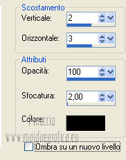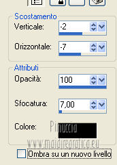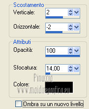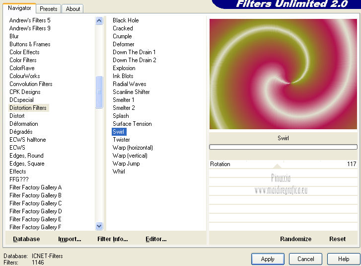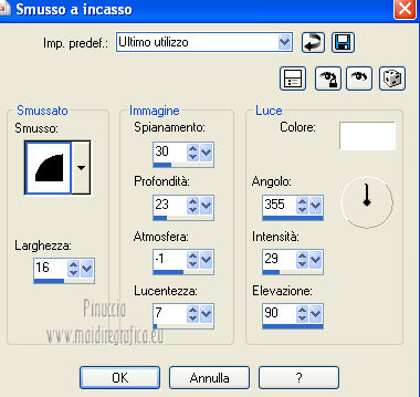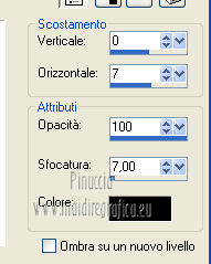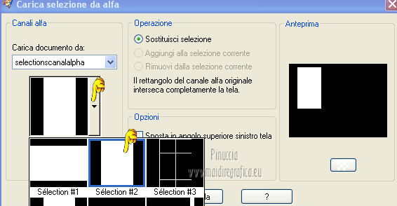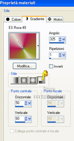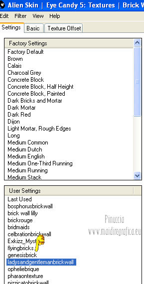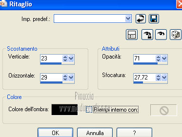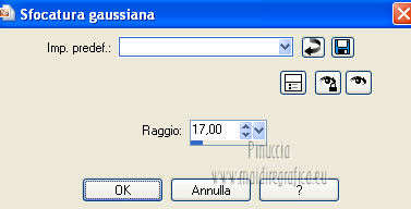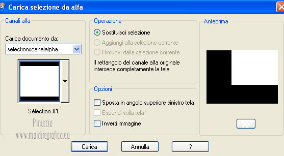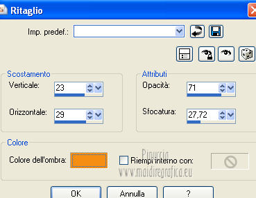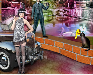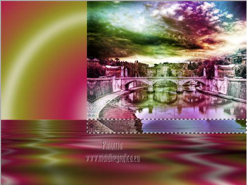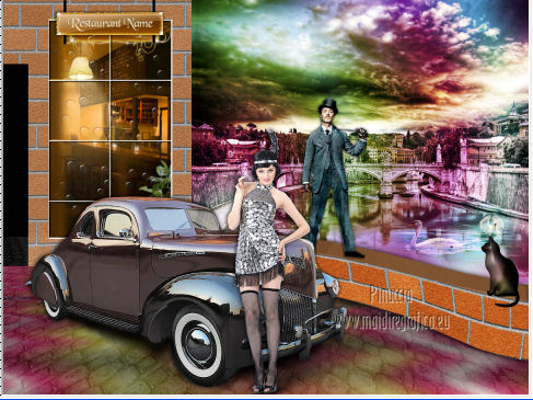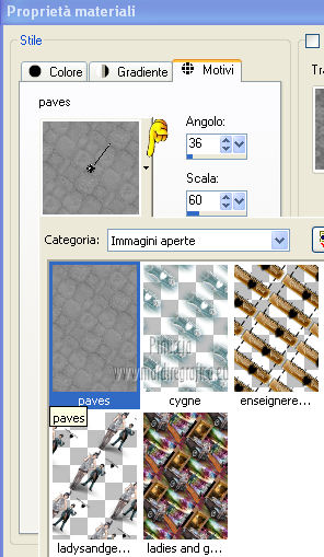Occorrente: Materiale qui Il materiale fa parte della collezione personale di Roserika. Per favore, lascia intatto il copyright. Filtri: Se hai problemi con i filtri, ricordati della mia sezione filtri qui Filters Unlimited 2.0 qui Alien Skin Eye Candy 5 Nature qui Alien Skin Eye Candy 5 Textures qui Mura's Meister - Perspective Tiling qui Metti i preset nelle rispettive cartelle del filtro. Con un doppio clic sul file, il preset sarà automaticamente installato nella cartella corretta. Metti il gradiente nella cartella Gradienti. 1. Apri "selectionscanalalpha". Questa immagine non è vuota, ma contiene le selezioni salvate sul canale alfa. Duplicala usando la combinazione di tasti maiuscola+D e chiudi l'originale. La copia - che la dimensione di 1200 x 900 pixels, sarà la base del tuo lavoro. Passa il colore di primo piano a Gradiente, e seleziona il gradiente ES Rosa49 con i seguenti settaggi. ![]() Riempi l'immagine trasparente con il gradiente.Effetti>Plugins>Filters Unlimited 2.0 - Distortion filters - Swirl. ![]() Regola>Sfocatura>Sfocatura gaussiana - raggio 17. ![]() Apri il tube "flood" e vai a Modifica>Copia. Torna al tuo lavoro e vai a Modifica>Incolla come nuovo livello. Effetti>Effetti di immagine>Scostamento. ![]() 2. Selezione>Carica/Salva selezione>Carica selezione da canale alfa. Selection#1 è già disponibile. Devi soltanto cliccare Carica. ![]() a questo punto, ho apportato una variante, per evitare che lo specchio d'acqua appaia come nella schermata sotto (che è il risultato finale senza la variante). ![]() Se vuoi seguire il tutorial originale, salta questo passaggio in corsivo. Selezione>Modifica selezione e l'area della selezione diventerà rossa. Premi il tasto D (valido per tutte le versioni) per attivare lo strumento Deformazione ![]() e allarga la selezione in basso, pressappoco come nel mio esempio. ![]() Di nuovo Selezione>Modifica selezione e il rosso sparirà. Premi il tasto M per liberarti dalla griglia dello strumento. Livelli>Nuovo livello raster. Apri l'immagine "paysage" e vai a Modifica>Copia. Torna al tuo lavoro e vai a Modifica>Incolla nella selezione. Selezione>Deseleziona. Cambia la modalità di miscelatura di questo livello in Luce netta. se hai seguito la mia variante in corsivo: attiva lo strumento Selezione , rettangolo,e seleziona la parte "aggiunta", come nell'esempio. ![]() Attiva il livello sottostante del tube "flood" e premi sulla tastiera il tasto CANC. Attiva il livello superiore. 3. Selezione>Carica/Salva selezione>Carica selezione da canale alfa. Apri il menu delle selezioni e carica Selection#2. ![]() Livelli>Nuovo livello raster. Apri l'immagine "restaurant" e vai a Modifica>Copia. Torna al tuo lavoro e vai a Modifica>Incolla nella selezione. Selezione>Deseleziona. Effetti>Plugins>Alien Skin Eye Candy 5 Nature - Water drop. Seleziona il preset ladysandgentlemanwaterdrop e ok. ![]() Imposta il colore di sfondo con il colore bianco. Selezione>Carica/Salva selezione>Carica selezione da canale alfa. Apri il menu delle selezioni e carica Selection#3. ![]() Livelli>Nuovo livello raster. Riempi la selezione con il colore bianco.Selezione>Deseleziona. Selezione>Carica/Salva selezione>Carica selezione da canale alfa. Apri il menu delle selezioni e carica Selection#4. ![]() Livelli>Nuovo livello raster. Effetti>Effetti 3D>Ritaglio, con il colore #f58e15. ![]() Livelli>Nuovo livello raster. Ripeti l'Effetto Ritaglio, con gli stessi settaggi, ma con il colore nero. ![]() Selezione>Deseleziona. Abbassa l'opacità di questo livello all'85%. Livelli>Unisci>Unisci giù. Livelli>Disponi>Sposta giù. 4. Attiva il livello soprastante. Effetti>Effetti 3D>Sfalsa ombra, con il colore nero. ![]() Livelli>Unisci>Unisci giù. Di nuovo Livelli>Unisci>Unisci giù. Selezione>Carica/Salva selezione>Carica selezione da canale alfa. Apri il menu delle selezioni e carica Selection#5. Livelli>Nuovo livello raster. Riempi il livello con il gradiente.Effetti>Plugins>Alien Skin Eye Candy 5 Texture - Brick wall. Seleziona il preset ladysandgentlemanbrickwall e ok. ![]() Selezione>Deseleziona. Selezione>Carica/Salva selezione>Carica selezione da canale alfa. Apri il menu delle selezioni e carica Selection#6. Livelli>Nuovo livello raster. Riempi il livello con il gradiente.Effetti>Plugins>Alien Skin Eye Candy 5 Texture - Brick wall, con i settaggi precedenti. Selezione>Deseleziona. Selezione>Carica/Salva selezione>Carica selezione da canale alfa. Apri il menu delle selezioni e carica Selection#7. Livelli>Nuovo livello raster. Riempi il livello con il gradiente.Effetti>Plugins>Alien Skin Eye Candy 5 Texture - Brick wall, con i settaggi precedenti. Selezione>Deseleziona. 5. Imposta il colore di sfondo con il colore nero. Selezione>Carica/Salva selezione>Carica selezione da canale alfa. Apri il menu delle selezioni e carica Selection#8. Livelli>Nuovo livello raster. Riempi la selezione con il colore nero.Selezione>Deseleziona. Livelli>Unisci>Unisci visibile. Apri la trama "pavés" e minimizzala. Passa il colore di primo piano a Motivi e cerca la trama nella lista dei motivi - nella categoria Immagini aperte. Imposta la trama con i seguenti settaggi. ![]() Livelli>Nuovo livello raster. Riempi il livello con il motivo.Effetti>Plugins>Mura's Meister - Perspective Tiling. Clicca su Reset per impostare i settaggi standard, e cambia height con 40. ![]() Selezione>Carica/Salva selezione>Carica selezione da canale alfa. Apri il menu delle selezioni e carica Selection#9. Premi sulla tastiera il tasto CANC. Selezione>Deseleziona. Cambia la modalità di miscelatura di questo livello in Luce netta. 6. Apri il tube "muret" e vai a Modifica>Copia. Torna al tuo lavoro e vai a Modifica>Incolla come nuovo livello. Effetti>Effetti di immagine>Scostamento. ![]() Effetti>effetti 3D>Sfalsa ombra, con il colore nero. ![]() Attiva il livello inferiore. Selezione>Carica/Salva selezione>Carica selezione da canale alfa. Apri il menu delle selezioni e carica Selection#10. Regola>Sfocatura>Sfocatu
