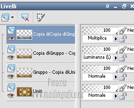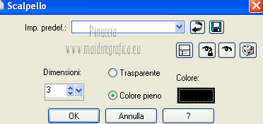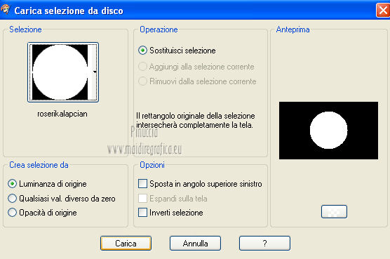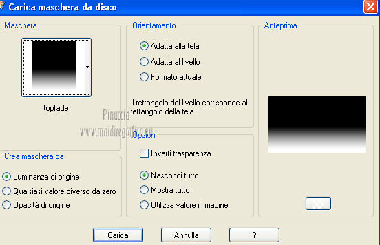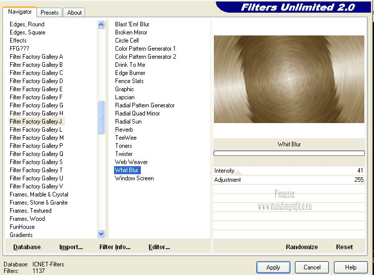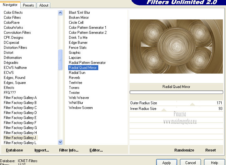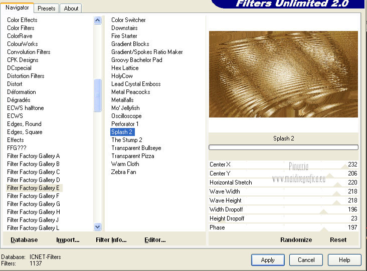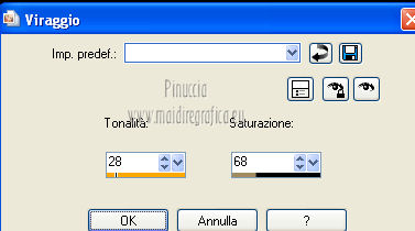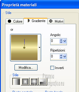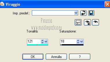 Occorrente: Materiale qui Il tube della donna è di lapcian. Il tube del fiore è di Alejandra Rosales. Per favore, lascia intatto il copyright. Filtri: Se hai problemi con i filtri, ricordati della mia sezione filtri qui Filters Unlimited 2.0 qui Filter Factory Gallery E qui Filter Factory Gallery J qui i filtri Factory Gallery si possono usare da soli o importati in Filters Unlimited 2.0. A volte possono esserci differenze nei risultati. Inoltre il tuo risultato potrebbe essere diverso dal mio, non soltanto a causa dell'uso del filtro, ma anche della versione di PSP che stai usando e del sistema operativo. Metti il gradiente "or" nella cartella Gradienti. Metti la maschera nella cartella Maschere. Metti la selezione nella cartella Selezioni. 1. Apri una nuova immagine trasparente 1024 x 600 pixels. Passa il colore di primo piano a Gradiente, e seleziona il gradiente "or" con i seguenti settaggi. ![]() Riempi l'immagine trasparente con il gradiente.Regola>Aggiungi/Rimuovi disturbo>Aggiungi disturbo. ![]() Regola>Tonalità e saturazione>Viraggio. ![]() Livelli>Duplica. Immagine>Ruota per gradi - 90 gradi a destra. ![]() Cambia la modalità di miscelatura di questo livello in Moltiplica. Livelli>Unisci>Unisci visibile. 2. Effetti>Plugins>Filter Factory Gallery J - Whirl Blur ![]() Ripeti l'Effetto una seconda volta. Effetti>Plugins>Filter Factory Gallery J - Radial Quad Mirror ![]() Ripeti l'Effetto una seconda volta. Livelli>Duplica. Immagine>Rifletti. Cambia la modalità di miscelatura di questo livello in Sovrapponi. Livelli>Unisci>Unisci visibile. 3. Livelli>Duplica. Effetti>Plugins>Filter Factory Gallery E - Splash 2, con i settaggi standard. ![]() Livelli>Carica/Salva maschera>Carica maschera da disco. Cerca e carica la maschera topfade. ![]() Livelli>Unisci>Unisci gruppo. Per rinforzare l'effetto: Livelli>Duplica. Ancora Livelli>Duplica. Regola>Tonalità e saturazione>Viraggio. ![]() Cambia la modalità di miscelatura di questo livello in Moltiplica. Cambia la modalità di miscelatura del livello sottostante in Luminanza (esistente). ![]() 4. Attiva il livello inferiore (Uniti). Selezione>Carica/Salva selezione>Carica selezione da disco. Cerca e carica la selezione roserikalapcian. ![]() Livelli>Nuovo livello raster. Apri l'immagine Lapcian e vai a Modifica>Copia. Torna al tuo lavoro e vai a Modifica>Incolla nella selezione. Selezione>Deseleziona. Livelli>Duplica. Effetti>Effetti 3D>Ritaglio. ![]() 6. Attiva il livello sottostante. Abbassa l'opacità di questo livello al 75%. ![]() Effetti>Effetti 3D>Scalpello - colore nero. ![]() Livelli>Duplica. Immagine>Ridimensiona, al 42%, tutti i livelli non selezionato. Spostalo nel cerchio in alto a sinistra.Cambia la modalità di miscelatura di questo livello in Luminanza (esistente). Livelli>Duplica. Immagine>Rifletti. 6. Livelli>Unisci>Unisci visibile. Apri il tube anneauxdores e vai a Modifica>Copia. Torna al tuo lavoro e vai a Modifica>Incolla come nuovo livello. Spostalo sul cerchio in alto a sinistra,vedi il mio esempio. Livelli>Duplica. Immagine>Rifletti. Apri il tube billes e vai a Modifica>Copia. Torna al tuo lavoro e vai a Modifica>Incolla come nuovo livello. Immagine>Ridimensiona, al 60%, tutti i livelli non selezionato. Spostalo in basso a sinistra,come nel mio esempio. Cambia la modalità di miscelatura di questo livello in Luminanza (Esistente). Livelli>Duplica. Immagine>Capovolgi. Sposta questo duplicato in basso e un po' più a destra.![]() Abbassa l'opacità di questo livello al 31%. 7. Apri il tube "texte" e vai a Modifica>Copia. Torna al tuo lavoro e vai a Modifica>Incolla come nuovo livello. Spostalo a destra, come nel mio esempio.Cambia la modalità di miscelatura di questo livello in Sovrapponi. Firma il tuo lavoro. Livelli>Unisci>Unisci tutto ed esporta come jpg ottimizzata, compressione 20. ![]() ![]() Le vostre versioni. Grazie ![]() Gerda ![]() Se hai problemi o dubbi, o trovi un link non funzionante, o anche soltanto per un saluto, scrivimi. |
