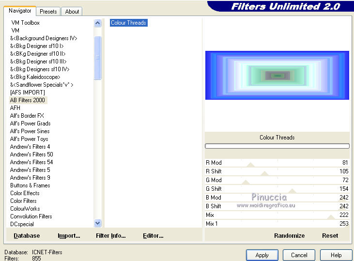 Effetti>Plugins>Filters Unlimited 2.0 - AB Filters 2000 - Colour Threads, con i settaggi standard.