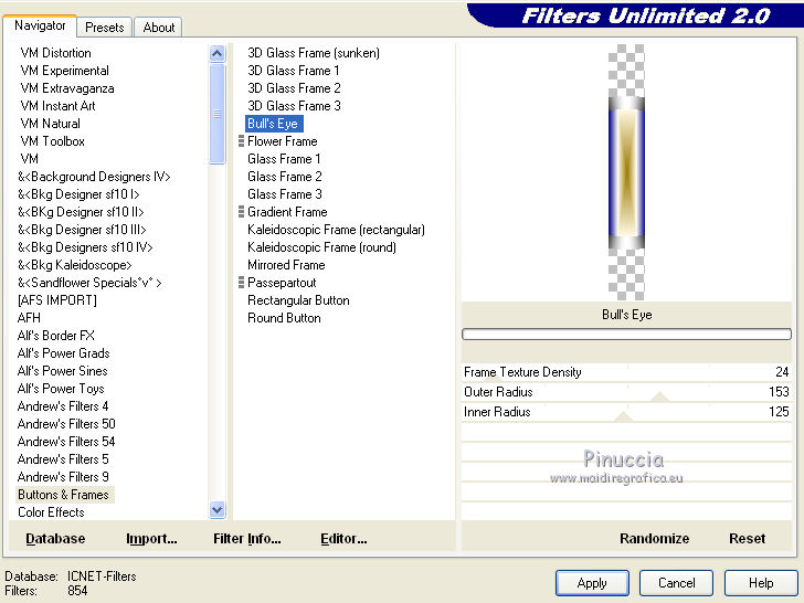 Effetti>Plugins>Filters Unlimited 2.0 - Buttons and Frames - Bull's Eye, con i settaggi standard.