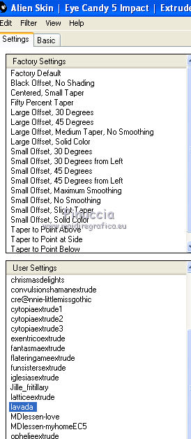 Metti il preset lavada nella cartella del filtro Alien Skin Eye Candy 5 Impact>Settings>Extrude. Doppio clic sul file e il preset sarà automaticamente installato.