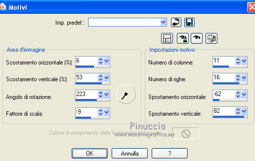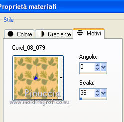 Passa il colore di sfondo a Motivi e seleziona il motivo Corel_08_079 con i seguenti settaggi.