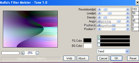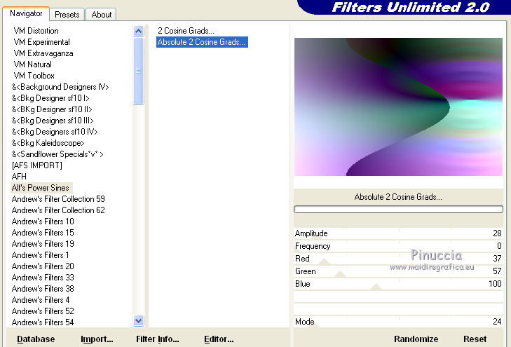 Effetti>Plugins>Filters Unlimited - Alf's Power Sines - Absolute 2 Cosine Grads, con i settaggi standard.