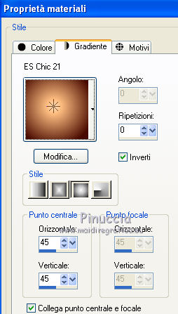 Passa il colore di primo piano a Gradiente, e seleziona il gradiente ES Chic 21, con i seguenti settaggi.