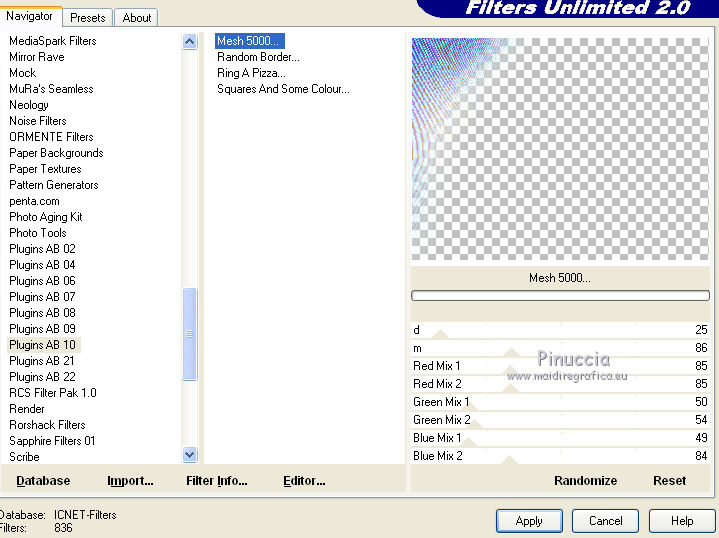 Effetti>Plugins>Filters Unlimited 2.0 - Plugins AB 10 - Mesh 5000, con i settaggi standard.