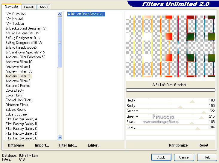Effetti>Plugins>Filters Unlimited - Andrew's Filter 6 - A Bit Left Over Gradient, con i settaggi standard.