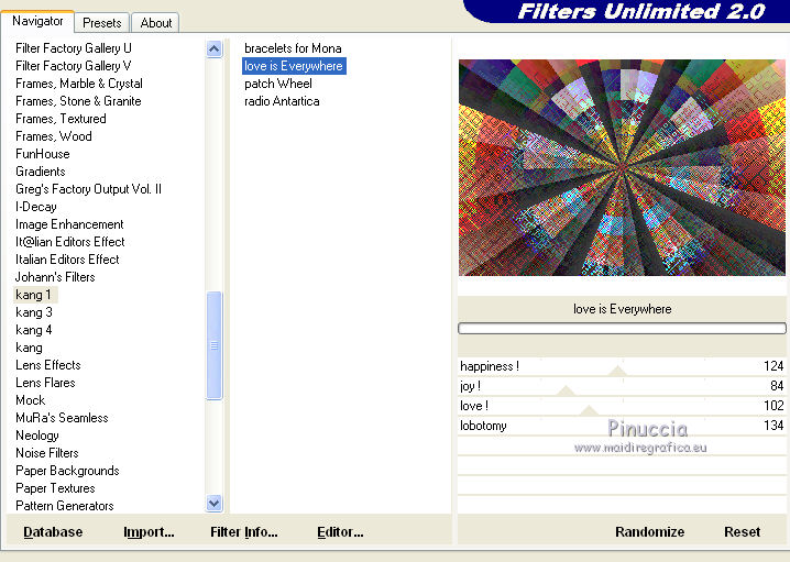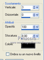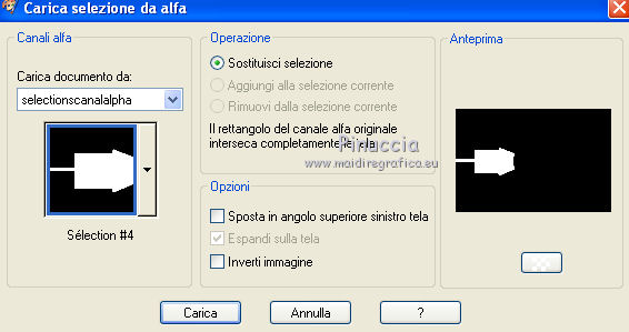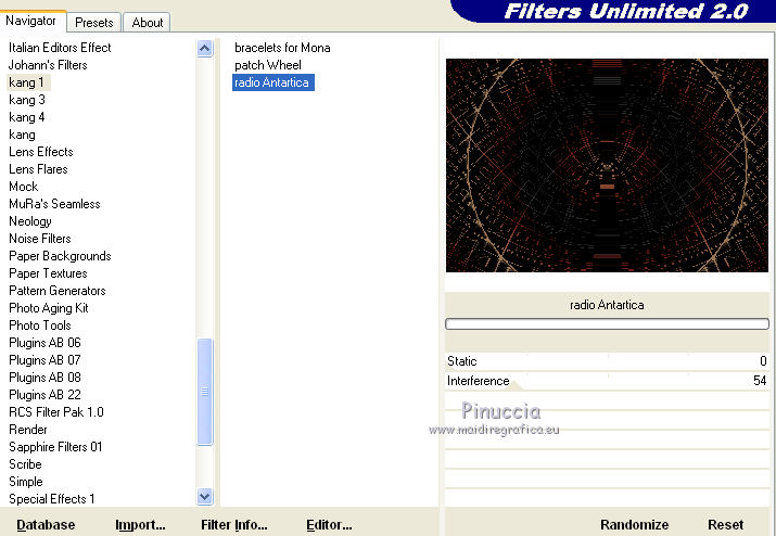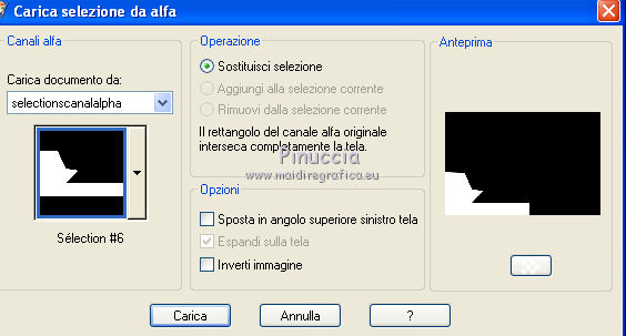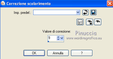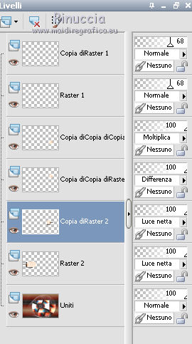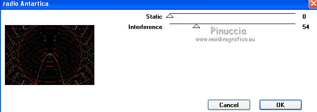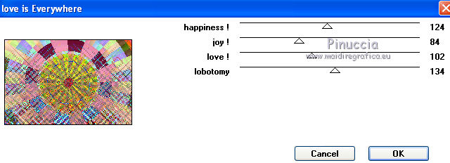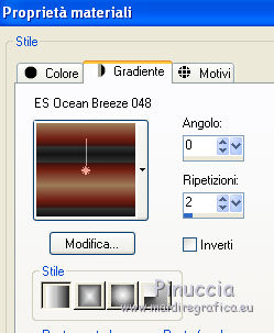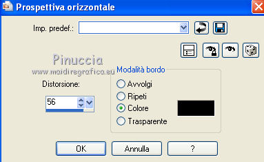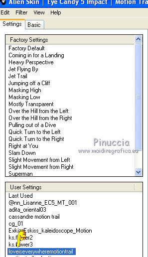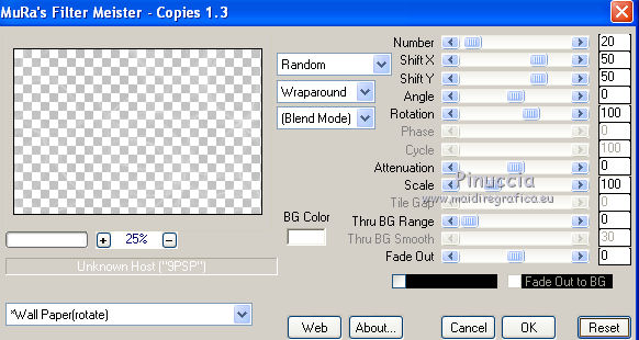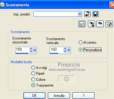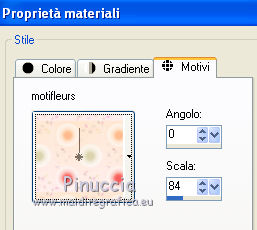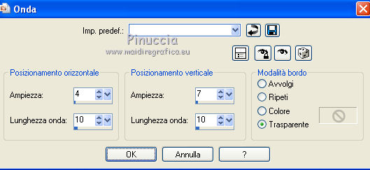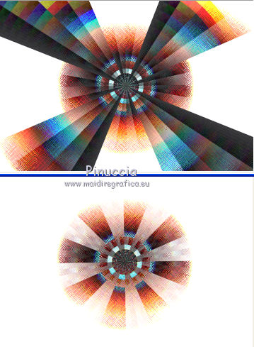 segno. Occorrente: Materiale qui Tutto il materiale fa parte della collezione personale di Roserika. Per favore, lascia intatto il copyright. Filtri: Se hai problemi con i filtri, ricordati della mia sezione filtri qui Filters Unlimited 2.0 qui Kang 1 qui Simple qui Alien Skin Eye Candy 5 Impact - Motion Trail qui Mura's Meister - Copies qui I filtri Kang si possono usare importandoli in Unlimited, ma possono funzionare anche da soli. A volte i filtri che supportano l'importazione in Unlimited hanno effetti differenti dall'uso singolo, ma queste differenze si possono verificare soltanto caso per caso. Metti il gradiente nella cartella Gradienti. Metti il preset loveiseverywheremotiontrail nella cartella del filtro: Alien Skin Eye Candy 5 Impact>Settings>Motion Trail. Se preferisci puoi importarlo, quando ti servirà, dalla cartella in cui hai scompattato il materiale. Vedi la scheda del filtro qui e come importare un preset in Eye Candy qui Apri "sélectionscanalalpha" e minimizzala. L'immagine non è vuota, ma contiene le selezioni salvate sul canale alpha. Con il file minimizzalo, le selezioni saranno disponibili quando ti serviranno. Apri il motivo motif fleurs e minimizzalo. Lo troverai nella lista dei motivi disponibili quando ti servirà. 1. Passa il colore di primo piano a Gradiente, e seleziona il gradiente ES Ocean Breeze048, con i seguenti settaggi. ![]() Imposta il colore di sfondo con il bianco. Apri una nuova immagine trasparente 900 x 600 pixels, e riempila con il gradiente.Livelli>Duplica. Effetti>Plugins>Kang 1 - Radio antartical con i settaggi standard. ![]() come puoi vedere, in questo caso importare il filtro in Unlimited non fa differenza ![]() ![]() Cambia la modalità di miscelatura di questo livello in Filtra. Livelli>Unisci>Unisci visibile. Livelli>Nuovo livello raster. Riempi con il gradiente.Effetti>Plugins>Kang 1 - Love is every where, con i settaggi standard. ![]() ![]() in questo caso, invece, la differenza è notevole. Già nella finestra di anteprima, le immagini sono diverse; il risultato poi lo è ancora di più. L'immagine superiore è il risultato del filtro importato in Unlimited; in basso il risultato del filtro usato da solo. Per questo esempio devi importare il filtro in Unlimited. ![]() Immagine>Ridimensiona, al 50%, tutti i livelli non selezionato. Livelli>Duplica. Effetti>Effetti di immagine>Scostamento. ![]() Cambia la modalità di miscelatura di questo livello in Sovrapponi. Attiva il livello superiore. 2. Selezione>Carica/Salva Selezione>Carica selezione da canale alpha. La selezione #selection1 è già presente. Devi soltanto cliccare Carica. ![]() Selezione>Inverti. Premi sulla tastiera il tasto CANC. Attiva il livello sottostante. Premi sulla tastiera il tasto CANC. Selezione>Deseleziona. Attiva il livello inferiore. Selezione>Carica/Salva selezione>Carica selezione da canale alpha. Carica nuovamente sélection#1. Livelli>Nuovo livello raster. Riempi con il colore bianco.Selezione>Modifica>Contrai - 1 pixel. Premi sulla tastiera il tasto CANc. Selezione>Deseleziona. 3. Effetti>Plugins>Eye Candy 5 Impact - Motion Trail, seleziona il preset loveiseverywheremotion trail e ok. ![]() Livelli>Duplica. Immagine>Ridimensiona, al 50%, tutti i livelli non selezionato. Effetti>Plugins>Mura's Meister - Copies. ![]() Selezione>Carica/Salva selezione>Carica selezione da canale alpha. Carica nuovamente sélection#1. Selezione>Inverti. Premi sulla tastiera il tasto CANC. Selezione>Deseleziona. Abbassa l'opacità di questo livello al 64%. Attiva il livello sottostante. Per rinforzare l'effetto: Livelli>Duplica. Livelli>Unisci>Unisci visibile. 4. Selezione>Carica/Salva selezione>Carica selezione da canale alpha. Apri il menu delle selezioni e carica sélection#2. ![]() Livelli>Nuovo livello raster. Riempi con il colore bianco.Selezione>Deseleziona. Abbassa l'opacità di questo livello al 68%. Livelli>Duplica. Immagine>Capovolgi. Attiva il livello inferiore. Selezione>Carica/Salva selezione>Carica selezione da canale alpha. Carica sélection#3. ![]() Livelli>Nuovo livello raster. Riempi con il colore bianco.Selezione>Deseleziona. 5. Passa il colore di primo piano a Motivi, apri il menu dei motivi e tra questi vedrai anche la lista dei files aperti. Seleziona il motivo motiffleur con i seguenti settaggi. ![]() Selezione>Carica/Salva selezione>Carica selezione da canale alpha. Carica sélection#4. ![]() Riempi la selezione con il motivo.Selezione>Deseleziona. Cambia la modalità di miscelatura di questo livello in Luce netta. Livelli>Unisci>Unisci giù. Livelli>Duplica. Immagine>Rifletti. Selezione>Carica/Salva selezione>Carica selezione da canale alpha. Carica sélection#5. ![]() Premi sulla tastiera il tasto CANC. Selezione>Deseleziona. 6. Immagine>Ridimensiona, al 70%, tutti i livelli non selezionato. Livelli>Duplica. Effetti>Effetti di immagine>Scostamento. ![]() Cambia la modalità di miscelatura di questo livello in Differenza. Livelli>Duplica. Immagine>Capovolgi. Cambia la modalità di miscelatura di questo livello in Moltiplica. Selezione>Carica/Salva selezione>Carica selezione da canale alpha. Carica nuovamente sélection#5. Premi sulla tastiera il tasto CANC. Attiva il livello sottostante e premi ancora il tasto CANC. Premi sulla tastiera il tasto CANC. Selezione>Deseleziona. 7. Attiva il secondo livello dal basso. Effetti>Effetti 3D>Sfalsa ombra, con il colore nero. ![]() Attiva il livello soprastante della copia riflessa. Effetti>Effetti 3D>Sfalsa ombra, con il colore nero. ![]() Questa dovrebbe essere la tua paletta dei livelli. ![]() 8. Attiva il livello superiore. Livelli>Unisci>Unisci giù. Livelli>Duplica, e porta questo livello sopra il livello inferiore Uniti. Immagine>Ruota per gradi - 90 gradi a destra. ![]() Effetti>Effetti di distorsione>Onda. ![]() Effetti>Effetti di immagine>Scostamento. ![]() Livelli>Duplica. Immagine>Rifletti. Effetti>Effetti di immagine>Scostamento. ![]() 9. Livelli>Unisci>Unisci visibile. Livelli>Duplica. Immagine>R