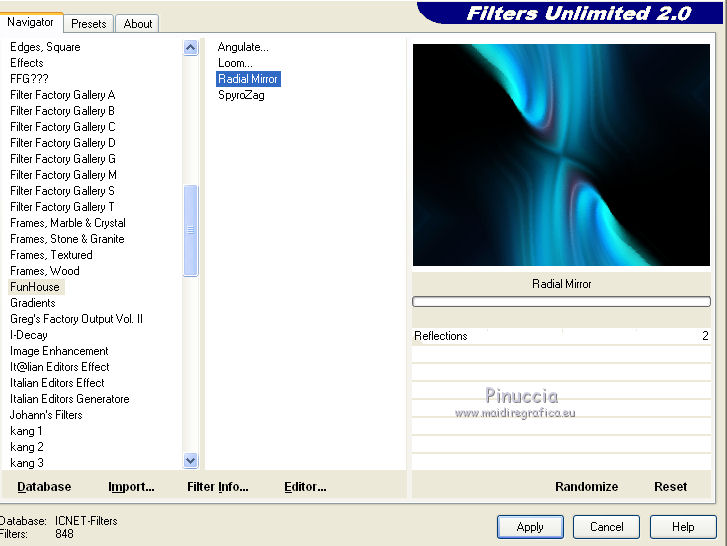 Effetti>Plugins>Filters Unlimited 2.0 - Funhouse - Radial Mirror, con i settaggi standard.
