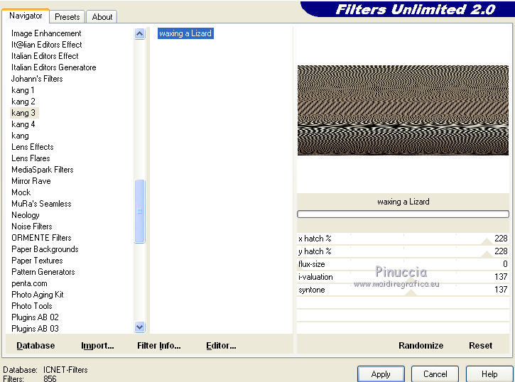 Effetti>Plugins>Filters Unlimited 2.0 - Kang 3 - Waving a Lizard, con i settaggi standard.