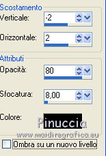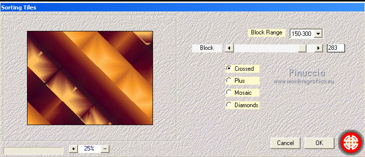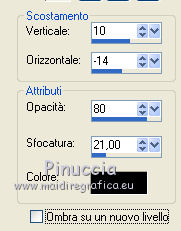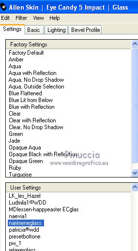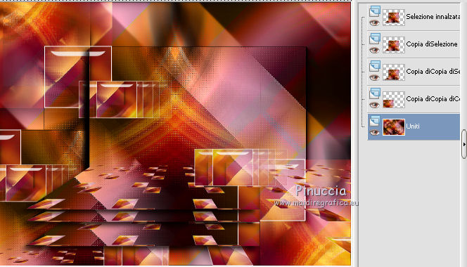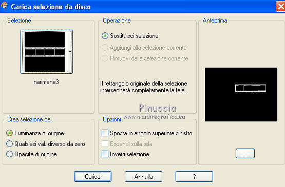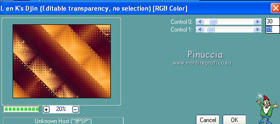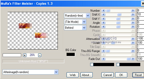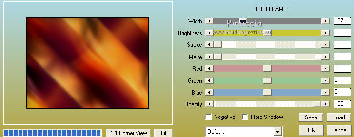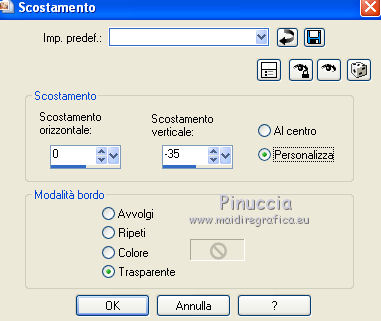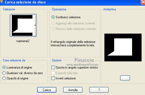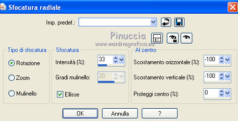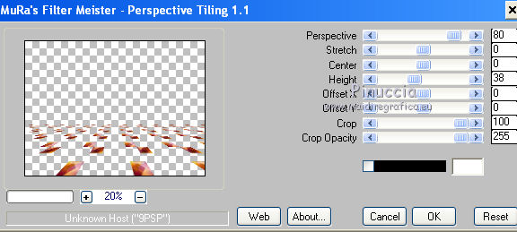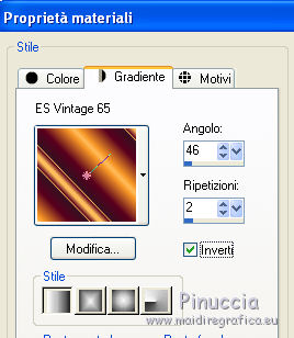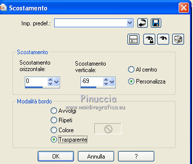 Occorrente: Materiale qui Il materiale fa parte della collezione personale di Roserika. Per favore, lascia intatto il copyright. Filtri: Se hai problemi con i filtri, ricordati della mia sezione filtri qui Mehdi qui Alien Skin Eye Candy 5 Impact qui AAA Frames - Foto Frame qui Mura's Meister - Copies qui Mura's Meister - Perspective Tiling qui L&K - L&K Djin qui Metti il preset "narimeneglass" nella cartella del filtro Alien Skin Eye Candy 5 Impact>Settings>Glass. Doppio clic sul file e il preset sarà automaticamente installato. Se preferisci puoi importarlo, quando ti servirà, dalla cartella in cui hai scompattato il materiale. Vedi la scheda del filtro qui e come importare un preset in Eye Candy qui Metti il gradiente nella cartella Gradienti. Metti le selezioni nella cartella Selezioni. 1. Passa il colore di primo piano a Gradiente, e seleziona il gradiente ES Vintage65, con i seguenti settaggi. ![]() Imposta il colore di sfondo con il colore bianco #ffffff. Apri una nuova immagine trasparente 1000 x 750 pixels, e riempila con il gradiente.Effetti>Plugins>Mehdi - Sorting Tiles. ![]() Effetti>Plugins>L&K - L&K Djin ![]() Effetti>Effetti di bordo>Aumenta. 2. Apri il tube femmeplumes e copia il livello Raster 1. Torna al tuo lavoro e vai a Modifica>Incolla come nuovo livello. Regola>Sfocatura>Sfocatura radiale. ![]() Effetti>Effetti di immagine>Motivo unico. ![]() Effetti>Plugins>L&K - L&K Djin, con i settaggi precedenti. Effetti>Effetti di bordo>Aumenta. Cambia la modalità di miscelatura di questo livello in Luce netta. Livelli>Duplica. Immagine>Rifletti. 3. Livelli>Unisci>Unisci visibile. Livelli>Duplica. Effetti>Plugins>AAA Frames - Foto Frame. ![]() Cambia la modalità di miscelatura di questo livello in Luminanza (Esistente). Attiva il livello sottostante. Immagine>Rifletti. Attiva nuovamente il livello soprastante. Livelli>Duplica. Immagine>Ruota per gradi - 90 gradi a sinistra. ![]() Immagine>Ridimensiona, al 50%, tutti i livelli non selezionato. Effetti>Effetti di immagine>Scostamento. ![]() Cambia la modalità di miscelatura di questo livello in Filtra. Livelli>Duplica. Immagine>Rifletti. Immagine>Capovolgi. 4. Livelli>Unisci>Unisci visibile. Selezione>Carica/Salva selezione>Carica selezione disco. Cerca e carica la selezione narimene. ![]() Selezione>Innalza selezione a livello. Livelli>Nuovo livello raster. Riempi con il colore bianco.Selezione>Modifica>Contrai - 2 pixels. Premi sulla tastiera il tasto CANC. Attiva nuovamente il livello sottostante. Effetti>Plugins>Alien Skin Eye Candy 5 Impact - Glass. Seleziona il preset narimeneglass e ok. ![]() Selezione>Deseleziona. Attiva nuovamente il livello superiore. Livelli>Unisci>Unisci giù. Livelli>Duplica. Immagine>Ridimensiona, al 60%, tutti i livelli non selezionato. Livelli>Duplica. Effetti>Plugins>Mura's Meister - Copies. ![]() Attiva il livello sottostante. Effetti>Plugins>Mura's Meister - Perspective Tiling, clicca su Reset per impostare i settaggi standard, e porta height a 38. ![]() 5. Livelli>Unisci>Unisci visibile. Selezione>Carica/Salva selezione>Carica selezione disco. Cerca e carica la selezione narimene2. ![]() Selezione>Innalza selezione a livello. Selezione>Deselezionsa. Effetti>Effetti 3D>Sfalsa ombra, con il colore nero. ![]() Livelli>Duplica. Livelli>Disponi>Sposta giù. Effetti>Effetti di immagine>Scostamento. ![]() Livelli>Duplica. Livelli>Disponi>Sposta giù - 2 volte. Effetti>Effetti di immagine>Scostamento. ![]() Livelli>Duplica. Livelli>Disponi>Sposta giù. Effetti>Effetti di immagine>Scostamento. ![]() Dovresti avere questo. ![]() 6. Livelli>Unisci>Unisci visibile. Selezione>Carica/Salva selezione>Carica selezione disco. Cerca e carica la selezione narimene3. ![]() Livelli>Nuovo livello raster. Riempi con il colore bianco.Selezione>Deseleziona. Livelli>Nuovo livello raster. Selezione>Carica/Salva selezione>Carica selezione disco. Cerca e carica la selezione narimene4. ![]() Apri il tube "paysage" e vai a Modifica>Copia. Torna al tuo lavoro e vai a Modifica>Incolla nella selezione. Selezione>Deseleziona. Livelli>Disponi>Sposta giù. Cambia la modalità di miscelatura di questo livello in Luce netta. 7. Attiva nuovamente il livello superiore. Effetti>Effetti 3D>Sfalsa ombra, con i settaggi precedenti. Apri il tube "lampadaire". Attiva lo strumento Bacchetta magica ![]() e clicca nello spazio trasparente per selezionarlo. ![]() Livelli>Nuovo livello raster. Selezione>Modifica>Espandi - 2 pixels. Modifica>Incolla nella selezione (il tube del paesaggio dovrebbe essere ancora in memoria; se così non fosse aprilo nuovamente e vai a Modifica>Copia). Selezione>Deseleziona. Livelli>Disponi>Sposta giù. Attiva il livello soprastante Effetti>Effetti 3D>Sfalsa ombra, con il colore nero. ![]() Apri il livello inferiore. ![]() Modifica>Copia Unione. Torna al tuo lavoro e vai a Modifica>Incolla come nuovo livello. Spostalo in basso a sinistra.![]() 8. Apri il tube "vases" e vai a Modifica>Copia. Torna al tuo lavoro e vai a Modifica>Incolla come nuovo livello. Spostalo sullo sfondovedi l'esempio finale. Apri il tube "femmeplumes", attiva il livello Raster 2 e vai a Modifica>Copia. Torna al tuo lavoro e vai a Modifica>Incolla come nuovo livello. Spostalo in basso a destra.Apri il tube "texte" e vai a Modifica>Copia. Torna al tuo lavoro e vai a Modifica>Incolla come nuovo livello. Spostalo in alto, come nel mio esempio.Immagine>Aggiungi bordatura, 20 pixels, simmetriche, con il colore bianco. Firma il tuo lavoro ed esporta come jpg ottimizzata, compressione 20. ![]() ![]() Se hai problemi o dubbi, o trovi un link non funzionante, o anche soltanto per un saluto, scrivimi. |