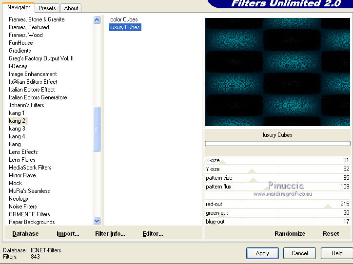 Effetti>Plugins>Filters Unlimited 2.0 - Kang 2 - Lyxury cubes, con i settaggi standard.
