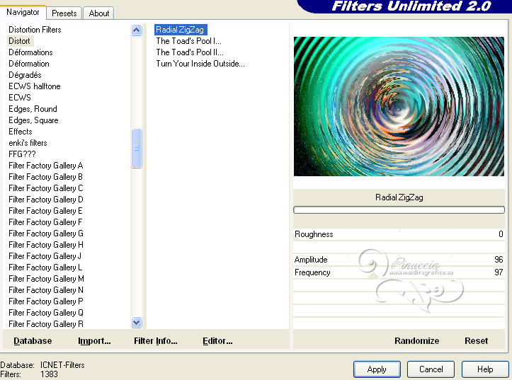 Effetti>Plugins>Filters Unlimited 2.0 - Distort - Radial Zigzag con i settaggi standard.