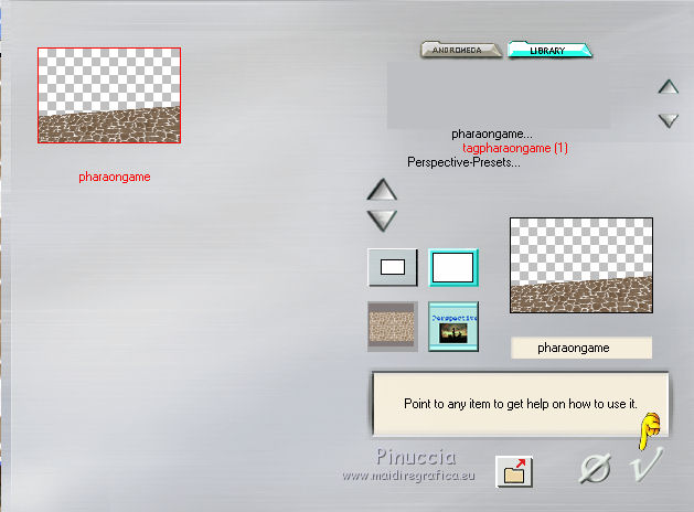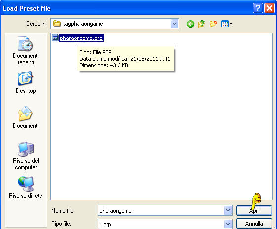 Metti il preset "pharaongame.pfp" nella cartella del Filtro Andromeda. Se preferisci, potrai importarlo - quando ti servirà - direttamente dalla cartella in cui hai scompattato il materiale.