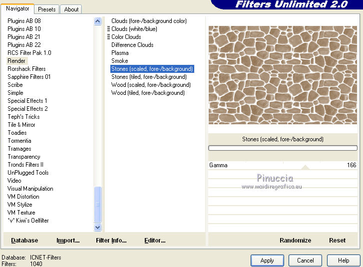 Effetti>Plugins>Filters Unlimited 2.0 - Render - Stones (scaled,fore/background).