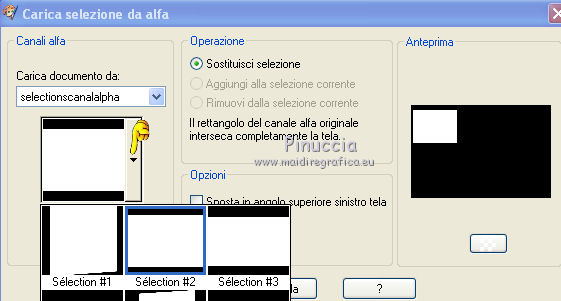 Apri il file "sélectionscanalalfa" in PSP e minimizzalo. L'immagine non è vuota, ma contiene le selezioni salvate sul canale alfa. Con il file minimizzato, le selezioni saranno disponibili quando ti serviranno.