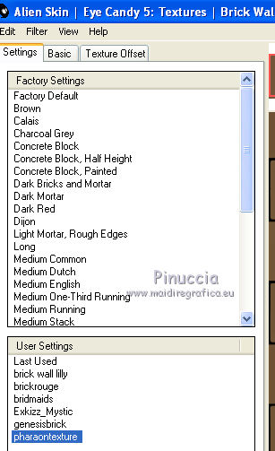Metti il preset "pharaontexture" nella cartella del filtro Alien Skin Eye Candy 5 Textures>Setting>Brick Wall (doppio clic sul file e il preset sarà automaticamente installato).
