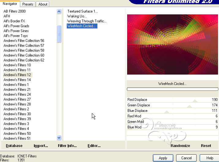 Effetti>Plugins>Filters Unlimited 2.0 - Andrew's Filters 12 - WireMesh Circled, con i settaggi standard.