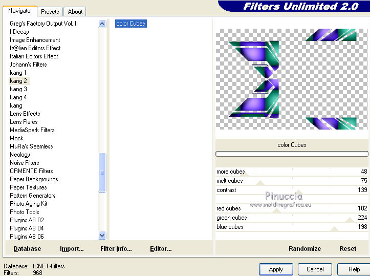 3. Effetti>Plugins>Filters Unlimited 2.0 - Kang - Color Cubes, con i settaggi standard.