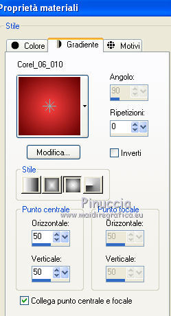 Passa il colore di primo piano a Gradiente e seleziona il gradiente Corel_06_010, stile Sprazzo di luce, con i seguenti settaggi (luce al centro).