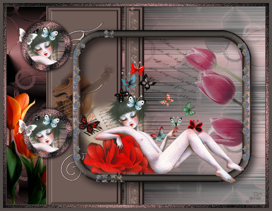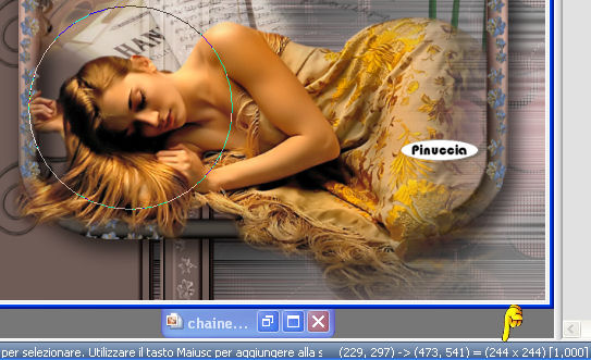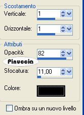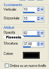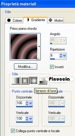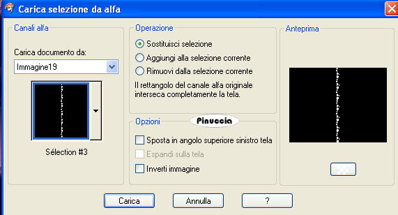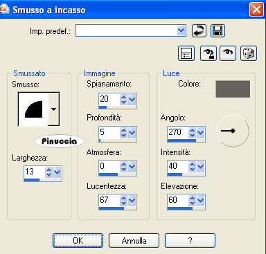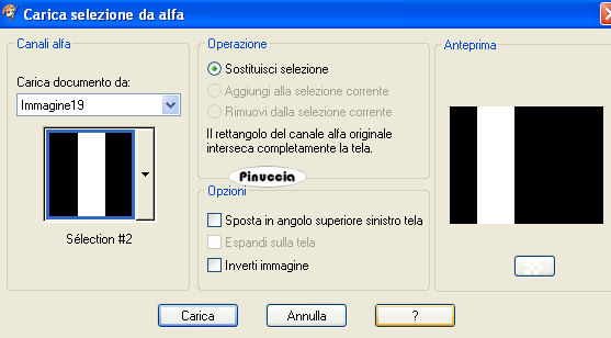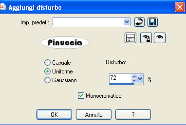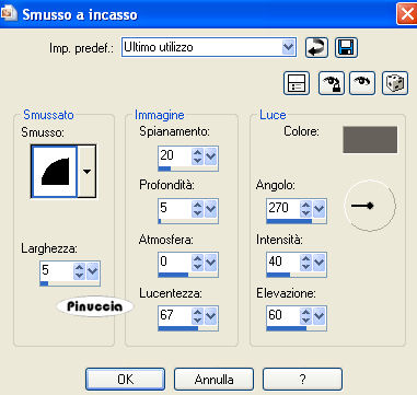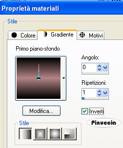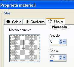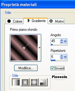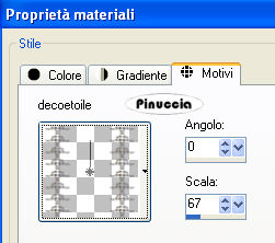 qui puoi trovare qualche risposta ai tuoi dubbi. Se l'argomento che ti interessa non è presente, ti prego di segnalarmelo. Questo tutorial è stato scritto con PSP X, ma può essere eseguito anche con le altre versioni di PSP. Occorrente: Materiale qui Il materiale scrap sono composizioni personali di Roserika. 1. Apri il file "selectioncanalalpharomantictulips". Questo file, che contiene le selezioni salvate sul canale alfa, sarà la base del tuo lavoro. Il livello è una trama, ma se vuoi, puoi metterne un'altra a tua scelta, o usare il viraggio per cambiare il colore. 2. Livelli>Nuovo livello raster. Selezione>Carica/Salva selezione>Carica selezione da canale alfa. La selezione "Sèlection 1" è già presente. Devi soltanto cliccare Carica. ![]() Apri il tube "bande verticale", e vai a Modifica>Copia. Torna al tuo lavoro e vai a Modifica>Incolla nella selezione. Selezione>Deseleziona. Attiva lo strumento Deformazione, ingrandisci il tuo piano di lavoro e tira il tube in alto e in basso, (vedi l'esempio finale) in modo che non si vedano i bordi del tube. 3. Apri il tube "decoforme" e minimizzalo nella tua area di lavoro. Passa il colore di primo piano a Motivi e, nella lista, seleziona il tube con i seguenti settaggi: ![]() Livelli>Nuovo livello raster. Selezione>Carica/Salva selezione>Carica selezione da canale alfa. Apri il menu cliccando sulla freccia a fianco del box, seleziona Sélection 2 e clicca Carica: ![]() Riempi la selezione con il motivo di primo piano.Selezione>Deseleziona. Effetti>Effetti 3D>Smusso a incasso, con i seguenti settaggi, colore #66615a. ![]() Effetti>Effetti 3D>Sfalsa ombra, con i seguenti settaggi, colore nero: ![]() Livelli>Unisci>Unisci giù. 4. Apri il tube "decoetoile" e minimizzalo. Come prima imposta questo motivo nella paletta dei materiali: ![]() Livelli>Nuovo livello raster. Selezione>Carica/Salva selezione>Carica selezione da canale alfa. Cerca e carica Sèlection 3. ![]() Riempi la selezione con il nuovo motivo impostato.Selezione>Deseleziona. Cambia la modalità di miscelatura di questo livello in luminanza (esistente). Regola>Messa a fuoco>Accentua messa a fuoco. Livelli>Unisci>Unisci giù. 5. Livelli>Nuovo livello raster. Selezione>Carica/Salva selezione>Carica selezione da canale alfa. Cerca e carica Sèlection 4: ![]() Imposta il colore di primo piano con #b38485, e il colore di sfondo con il nero. Passa il colore di primo piano a Gradiente di primo piano/sfondo, con i seguenti settaggi: ![]() Riempi la selezione con questo gradiente.Effetti>Effetti 3D>Smusso a incasso, con i settaggi precedenti ma cambiando la larghezza a 13. ![]() 6. Mantieni selezionato. Rimetti nuovamente il tube "decoetoile" come motivo di primo piano, ma cambiando la scala a 62. ![]() Riempi la selezione con questo motivo.Selezione>Deseleziona. Regola>Messa a fuoco>Metti a fuoco. Effetti>Effetti 3D>Sfalsa ombra, con i settaggi usati al punto 3. Livelli>Duplica. Immagine>Rifletti. 7. Sposta il livello sul lato destro del quadro.Attiva lo strumento Gomma e cancella la parte di cornice che copre la decorazione.![]() ![]() Livelli>Unisci>Unisci giù. 8. Effetti>Effetti 3D>Sfalsa ombra, con i seguenti settaggi, colore nero. ![]() 9. Apri il tube "femmeeallongee", e vai a Modifica>Copia. Torna al tuo lavoro e vai a Modifica>Incolla come nuovo livello. Posiziona il tube come nell'esempio finale.10. Apri il tube "violon", e vai a Modifica>Copia. Torna al tuo lavoro e vai a Modifica>Incolla come nuovo livello. Posiziona il tube a sinistra verso il centro,(Vedi l'esempio finale). Livelli>Disponi>Sposta giù. Cambia la modalità di miscelatura di questo livello in Filtra, e abbassa l'opacità all'85%. 11. Attiva il livello di sfondo (Arrière-plan). Apri il tube "tulipesjaunes", e vai a Modifica>copia. Torna al tuo lavoro e vai a Modifica>Incolla come nuovo livello. Posiziona i fiori a destra, come nel mio esempio.Abbassa l'opacità di questo livello al 68%. 12. Apri il tube "tulipesoranges" e vai a Modifica>Copia. Torna al tuo lavoro e vai a Modifica>Incolla come nuovo livello. Posiziona questi fiori in basso a sinistra.Controlla che tutto sia al posto giusto e vai a Livelli>Unisci>Unisci tutto. ![]() 13. Apri il tube "textepinceau", e vai a Modifica>copia. Torna al tuo lavoro e vai a Modifica>Incolla come nuovo livello. Posizionalo dentro la cornice,(Vedi l'esempio finale). 14. Attiva lo strumento Selezione , cerchio, sfumatura 3,e traccia un cerchio sul viso della donna di circa 245x245 (puoi controllare sulla barra inferiore le misure della selezione). ![]() Assicurati di essere posizionato sul livello sfondo e vai Modifica>Copia. Modifica>Incolla come nuova IMMAGINE, e minimizza l'immagine per il momento. Torna al tuo lavoro e vai a Selezione>Deseleziona. 15. Attiva il livello superiore. Livelli>Nuovo livello raster. Selezione>Carica/Salva selezione>Carica selezione da canale alfa. Cerca e carica la selezione Selection 5. Passa nuovamente il colore di primo piano a Gradiente, ma cambiando i settaggi come nella schermata: ![]() Riempi la selezione con questo gradiente.Regola>Aggiungi/Rimuovi disturbo>Aggiungi disturbo: ![]() Selezione>Modifica>Contrai - 18 pixels. Attiva la piccola immagine che hai messo da parte e vai a Modifica>Copia. Torna al tuo lavoro. Livelli>Nuovo livello raster. Modifica>Incolla nella selezione. Selezione>Deseleziona. Abbassa l'opacità di questo livello all'88%. Livelli>Unisci>Unisci giù. Effetti>Effetti 3D>Sfalsa ombra, con i seguenti settaggi, colore nero: ![]() 17. Apri il tube "chainedoree" e vai a Modifica>Copia. Torna al tuo lavoro. Livelli>Nuovo livello raster. Selezione>Carica/Salva selezione>Carica selezione da canale alfa. Cerca e carica la selezione Sélection 6. Modifica>Incolla nella selezione. Selezione>Deseleziona. Livelli>Disponi>Sposta giù. Effetti>Effetti 3D>Sfalsa ombra, con i settaggi precedenti. Livelli>Unisci>Unisci tutto. 18. Apri il tube "papillon" e vai a Modifica>Copia. Torna al tuo lavoro e vai a Modifica>Incolla come nu