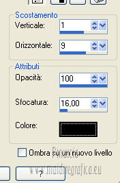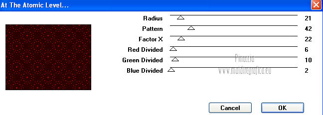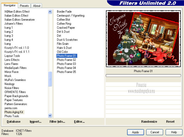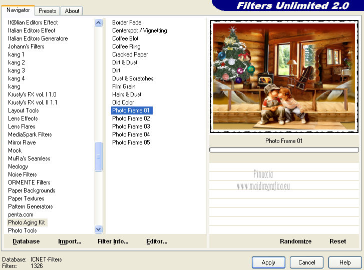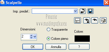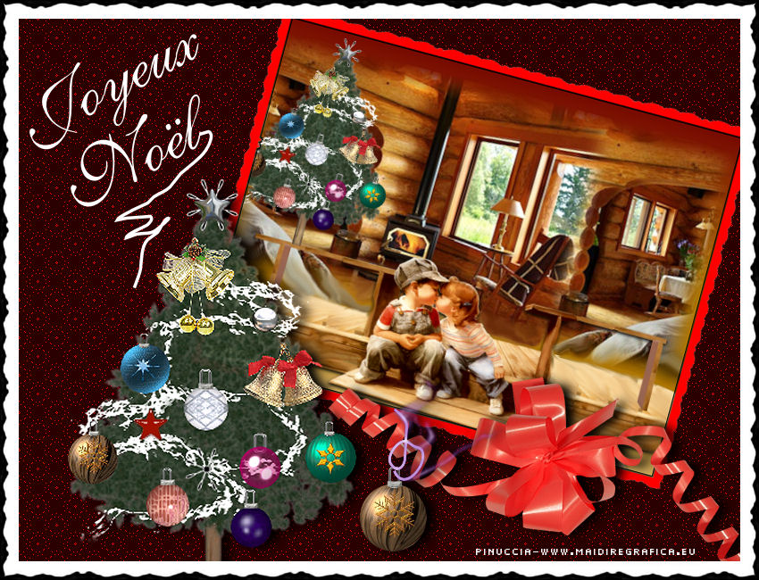 Occorrente: Materiale qui Filtri: Se hai problemi con i filtri, ricordati della mia sezione filtri qui Filters Unlimited 2.0 qui Photo Aging Kit qui Tramages qui 1. Imposta il colore di primo piano con un colore rosso. Per il mio esempio ho usato #ff0000. Apri l'immagine "interieurchalet", che sarà la base del tuo lavoro. Livelli>Innalza livello di sfondo. Immagine>Dimensioni tela. ![]() Apri il tube "enfantsescalier" e vai a Modifica>Copia. Torna al tuo lavoro e vai a Modifica>Incolla come nuovo livello. Posiziona il tube in basso, come nell'esempio.![]() 2. Apri il tube "sapindenoel" e vai a Modifica>Copia. Torna al tuo lavoro e vai a Modifica>Incolla come nuovo livello. Sposta il tube a sinistra, come nell'esempio.![]() 3. Livelli>Unisci>Unisci visibile. Effetti>Plugins>Filters Unlimited 2.0 - Photo Aging Kit - Photo Frame 1. ![]() 4. Attiva lo strumento Bacchetta magica , tolleranza 20,e clicca nel bordo bianco per selezionarlo. ![]() Livelli>Nuovo livello raster. Riempi con il colore rosso.5. Effetti>Effetti 3D>Scalpello. ![]() Selezione>Deseleziona. Attiva il livello inferiore. Seleziona il bordo nero con la bacchetta magica ![]() ![]() Premi sulla tastiera il tasto CANC. Selezione>Deseleziona. 6. Immagine>Ridimensiona, al 65%, tutti i livelli non selezionato. Immagine>Ruota per gradi - 15 gradi a destra. ![]() Sposta l'immagine in alto a destra.![]() 7. Livelli>Nuovo livello raster. Livelli>Disponi>Porta sotto. Riempi con il colore rosso.Effetti>Plugins>Tramages - At The Atomic Level, con i settaggi standard. ![]() 8. Attiva il livello superiore. Apri il tube kTs_Jm20.copiepsp e vai a Modifica>Copia. Torna al tuo lavoro e vai a Modifica>Incolla come nuovo livello. Spostalo in basso a destra.![]() Effetti>Effetti 3D>Sfalsa ombra, con il colore nero. ![]() 9. Apri il tube "texte" e vai a Modifica>Copia. Torna al tuo lavoro e vai a Modifica>Incolla come nuovo livello. Spostalo nell'angolo in alto a sinistra,non troppo vicino ai bordi. 10. Attiva nuovamente il tube "sapindenoel" e vai a Modifica>Copia. Torna al tuo lavoro e vai a Modifica>Incolla come nuovo livello. Immagine>Ridimensiona, al 125%, tutti i livelli non selezionato. Regola>Messa a fuoco>Metti a fuoco. Spostalo in basso a sinistra.![]() Effetti>Effetti 3D>Sfalsa ombra, con i settaggi precedenti. 11. Apri il tube "boulenoel" e vai a Modifica>Copia. Torna al tuo lavoro e vai a Modifica>Incolla come nuovo livello. Spostalo in basso al centro.![]() 12. Livelli>Unisci>Unisci visibile. Effetti>Plugins>Filters Unlimited 2.0 - Photo Aging Kit - Photo Frame 1. ![]() Se vuoi lasciare il piccolo bordo nero: Firma il tuo lavoro ed esporta come jpg ottimizzata, compressione 20. ![]() Se vuoi uno sfondo trasparente, seleziona il bordo nero con la bacchetta magica ![]() Premi sulla tastiera il tasto CANC. Selezione>Inverti. Selezione>Modifica>Contrai - 2 pixels. Selezione>Modifica>Sfuma - 2 pixels. Selezione>Inverti. Premi sulla tastiera il tasto CANC. Se vuoi, aggiungi un leggero Effetto Sfalsa ombra. Per il mio esempio ![]() Ripeti l'Effetto Sfalsa ombra, con i valori in negativo. Firma il tuo lavoro ed esporta in formato png. Esempio in formato jpg. ![]() ![]() Se hai problemi o dubbi, o trovi un link non funzionante, o anche soltanto per un saluto, scrivimi. |