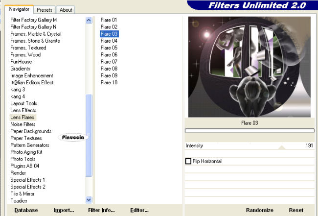 7. Effetti>Plugins>Filters Unlimited - Lens Flare - Flare 03, con i settaggi standard.