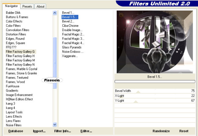 Effetti>Plugins>Filters Unlimited - Factory Gallery G - Bevel 1.50, con i settaggi standard.