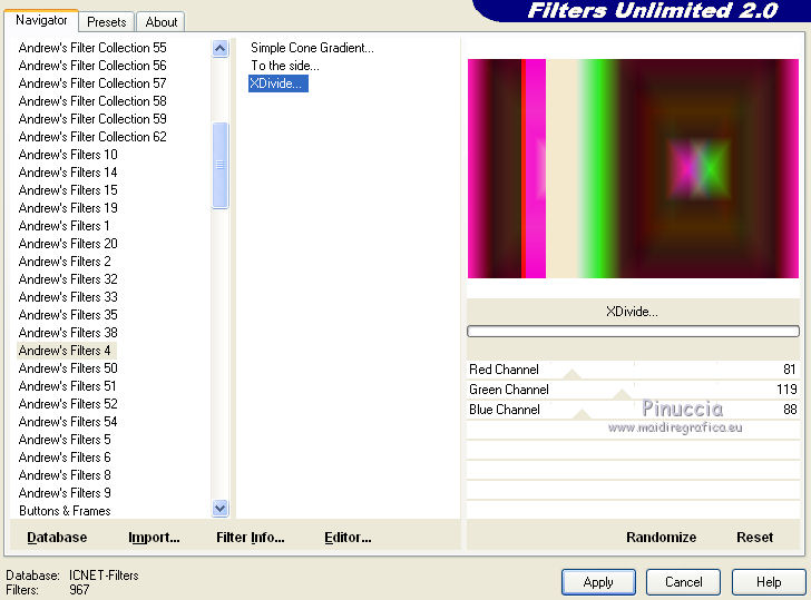 Effetti>Plugins>Filters Unlimited - Andrew's Filters 4 - XDivide, con i settaggi standard.