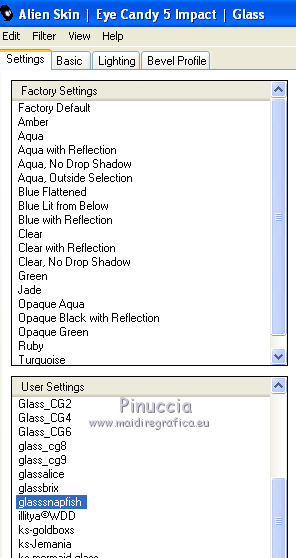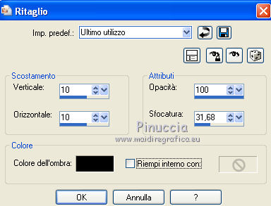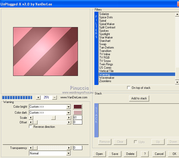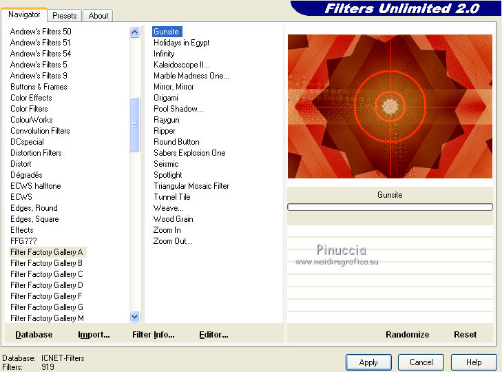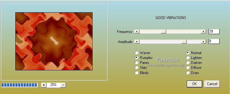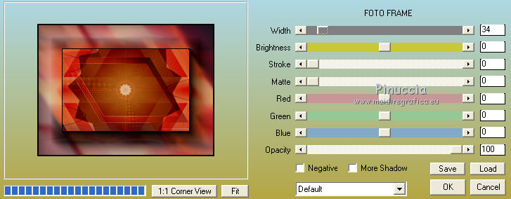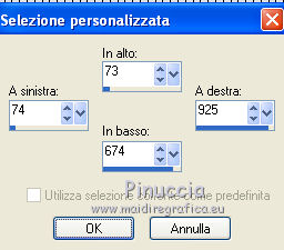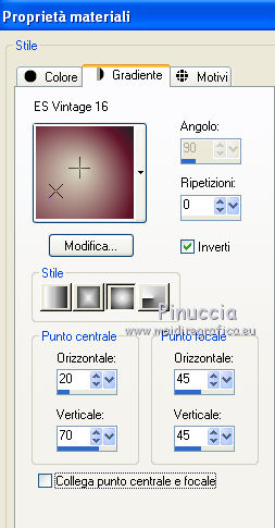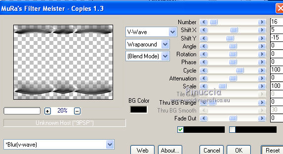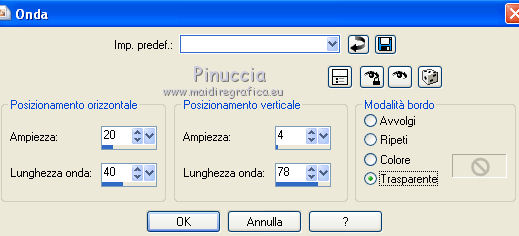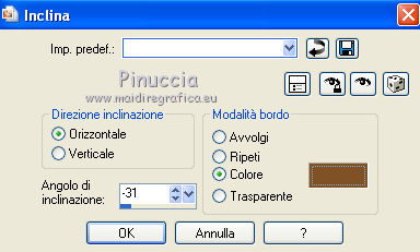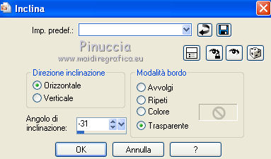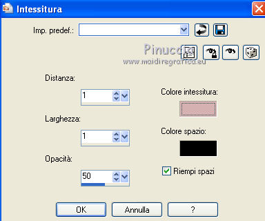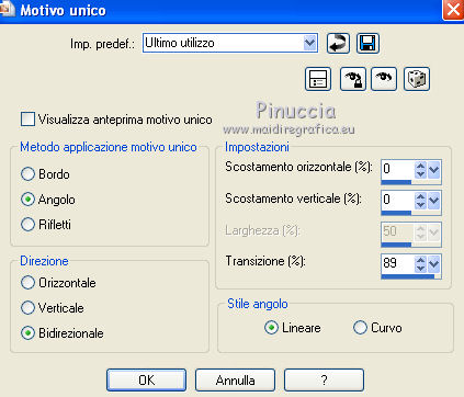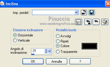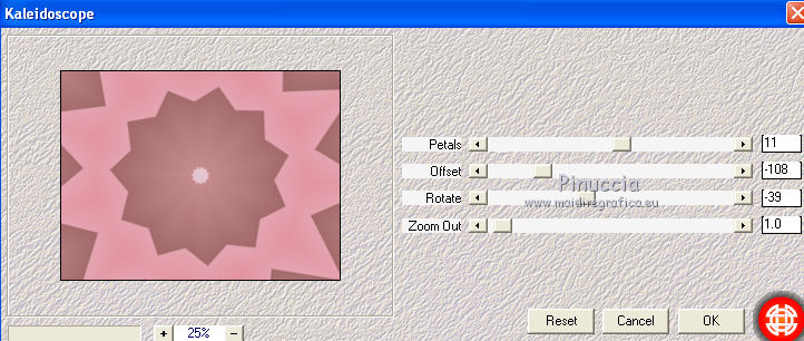 Occorrente: Materiale qui Il materiale fa parte della collezione personale di Roserika. Per favore, lascia intatto il copyright. Filtri: Se hai problemi con i filtri, ricordati della mia sezione filtri qui Alien Skin Eye Candy 5 Impact qui Filters Unlimited 2.0 qui Filter Factory Gallery A qui Filter Factory Gallery G qui Mehdi - Kaleidoscope qui Simple qui AAA Filters, AAA Frames qui VanDerLee - Unplugged X qui Mura's Meister - Copies qui I filtri Factory Gallery per essere usati devono prima essere convertiti. Come fare vedi qui Si usano importandoli in Filters Unlimited (come fare vedi qui) ma possono funzionare anche da soli. Le factory fornite sono state già convertite. Metti il preset "snapfish" nella cartella del filtro Alien Skin Eye Candy 5 Impact>Settings>Glass. Doppio clic sul file e il preset sarà automaticamente installato. Se preferisci puoi importarlo, quando ti servirà, dalla cartella in cui hai scompattato il materiale. Vedi la scheda del filtro qui e come importare un preset in Eye Candy qui Metti la selezione nella cartella Selezioni. Metti il gradiente ES Vintage 16 nella cartella Gradienti. 1. Apri una nuova immagine trasparente 1000 x 750 pixels. Passa il colore di primo piano a Gradiente e seleziona il gradiente ES Vintage 16 con i seguenti settaggi. ![]() Riempi l'immagine trasparente con il gradiente.Effetti>Effetti di trama>Intessitura, colore intessitura: #d5b1b2; riempi spazi: #000000 ![]() 2. Effetti>Plugins>VanDerLee - Unplugged X - seleziona l'Effetto Warning, con i seguenti settaggi: colore 1 #63252d; colore 2 #cea8a9. ![]() Effetti>Plugins>Mehdi - Kaleidoscope ![]() 3. Livelli>Nuovo livello raster. Riempi con il gradiente.Cambia la modalità di miscelatura di questo livello in Rafforza. Immagine>Ridimensiona, all'80%, tutti i livelli non selezionato. Immagine>Rifletti. Effetti>Effetti geometrici>Inclina - colore #805125. ![]() Effetti>Effetti di immagine>Motivo unico. ![]() 4. Effetti>Plugins>Simple - 4 way average. Livelli>Unisci>Unisci visibile. Livelli>Duplica. Effetti>Plugins>Filters Unlimited 2.0 - Filter Factory Gallery G - Pseudo Gamma, con i settaggi standard. ![]() Selezione>Seleziona tutto. Selezione>Modifica>Contrai - 73 pixels. Selezione>Inverti. Effetti>Plugins>AAA Filters - Good Vibrations. ![]() Livelli>Nuovo livello raster. Riempi con il gradiente.Cambia la modalità di miscelatura di questo livello in Filtra. Mantieni selezionato, e attiva il livello sottostante. Selezione>Inverti. Effetti>Plugins>Filters Unlimited 2.0 - Filter Factory Gallery A - Gunsite. ![]() Livelli>Nuovo livello raster. Riempi con il colore nero.Selezione>Modifica>Contrai - 2 pixels. Premi sulla tastiera il tasto CANC. Selezione>Deseleziona. 5. Livelli>Duplica. Livelli>Disponi>Sposta giù. Effetti>Effetti di distorsione>Onda. ![]() Livelli>Duplica. Immagine>Capovolgi. Livelli>Unisci>Unisci giù. 6. Livelli>Nuovo livello raster. Livelli>Disponi>Sposta giù. Selezione>Carica/Salva selezione>Carica selezione da disco. Cerca e carica la selezione snapfish. ![]() Effetti>Effetti 3D>Ritaglio. ![]() Effetti>Plugins>Alien Skin Eye Candy 5 Impact - Glass. Seleziona il preset glasssnapfish e ok. ![]() Selezione>Deseleziona. 7. Livelli>Duplica. Effetti>Plugins>Simple - Top Left Mirror. Effetti>Plugins>Mura's Meister - Copies. ![]() Livelli>Disponi>Sposta giù. Effetti>Effetti geometrici>Inclina, con i settaggi precedenti, ma con il colore nero. ![]() Attiva il livello superiore (il livello con modalità Filtra). ![]() Livelli>Duplica. Immagine>Ridimensiona, al 50%, tutti i livelli non selezionato. Cambia la modalità di miscelatura di questo livello in Luce netta. Effetti>Effetti geometrici>Inclina, con i settaggi precedenti, ma selezionato Trasparente. ![]() Effetti>Effetti di immagine>Motivo unico, con i settaggi precedenti. Effetti>Effetti di bordo>Aumenta. Livelli>Unisci>Unisci visibile. 8. Modifica>Copia. Attiva lo strumento Selezione ,clicca sull'icona Selezione personalizzata ![]() e imposta i seguenti settaggi: ![]() Livelli>Nuovo livello raster. Modifica>Incolla nella selezione. Selezione>Deseleziona. Immagine>Rifletti. Regola>Messa a fuoco>Metti a fuoco. Effetti>Plugins>AAA Frames - Foto Frame. ![]() Effetti>Effetti di bordo>Aumenta. questo passaggio è una mia variante. Decidi tu se vuoi seguire il mio esempio o saltarlo. Attiva il livello superiore. Selezione>Seleziona tutto. Selezione>Mobile. Selezione>Immobilizza. Effetti>Plugins>AAA Frames - Foto Frame, con i settaggi precedenti. Selezione>Deseleziona. Livelli>Unisci>Unisci visibile. 9. Apri il tube "balançoire" e vai a Modifica>Copia. Torna al tuo lavoro e vai a Modifica>Incolla come nuovo livello. Spostalo a sinistra, come nel mio esempio.Apri il tube "chien" e vai a Modifica>Copia. Torna al tuo lavoro e vai a Modifica>Incolla come nuovo livello. Spostalo in basso al centro.Apri il tube "femme" e vai a Modifica>Copia. Torna al tuo lavoro e vai a Modifica>Incolla come nuovo livello. Spostalo in basso a destra.Apri il tube "texte" e vai a Modifica>Copia. Torna al tuo lavoro e vai a Modifica>Incolla come nuovo livello. Spostalo in alto, come nel mio esempio.Immagine>Aggungi bordatura, 20 pixels, simmetriche, con il colore nero. Per il mio esempio ho apportato questa variante. Selezione>Seleziona tutto. Selezione>Modifica>Contrai - 20 pixels. Effetti>Effetti 3D>Ritaglio. ![]() Risultato senza questa variante ![]() Firma il tuo lavoro ed esporta come jpg ottimizzata, compressione 20. ![]() Questo l'esempio senza la mia variante al punto 8. ![]() ![]() Se hai problemi o dubbi, o trovi un link non funzionante, o anche soltanto per un saluto, scrivimi. |