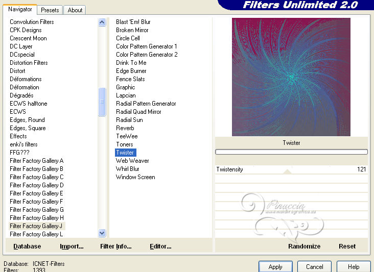 Effetti>Plugins>Filters Unlimited 2.0 - Filter Factory Gallery J - Twister, con i settaggi standard.