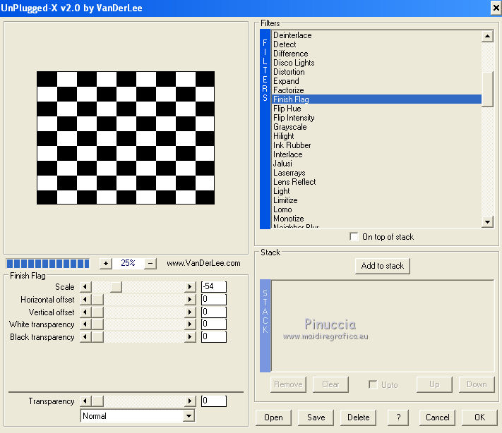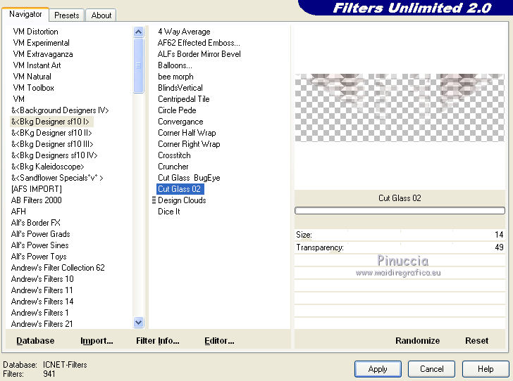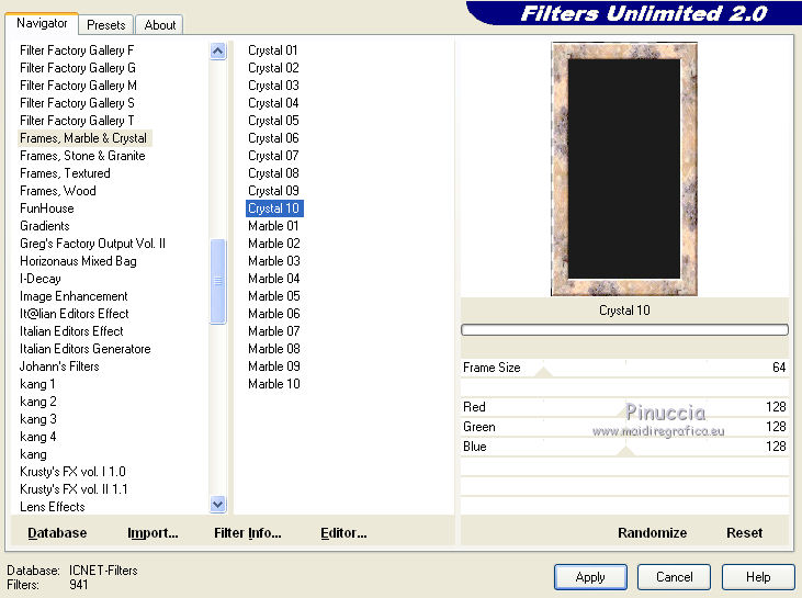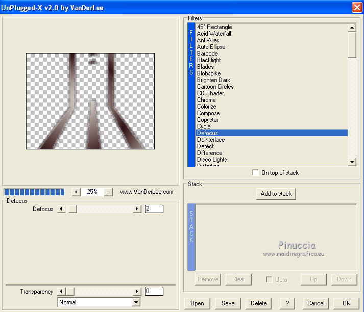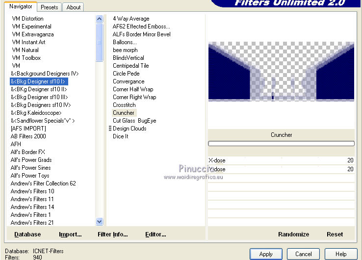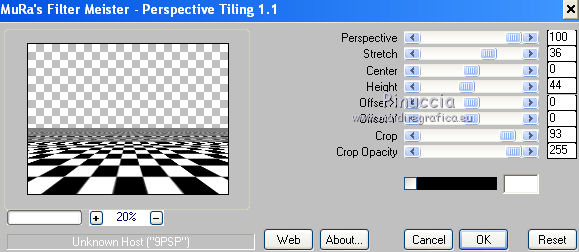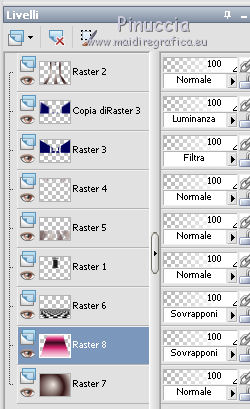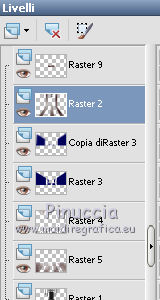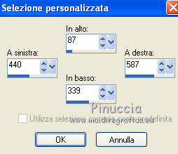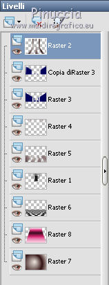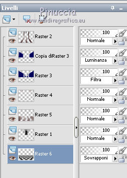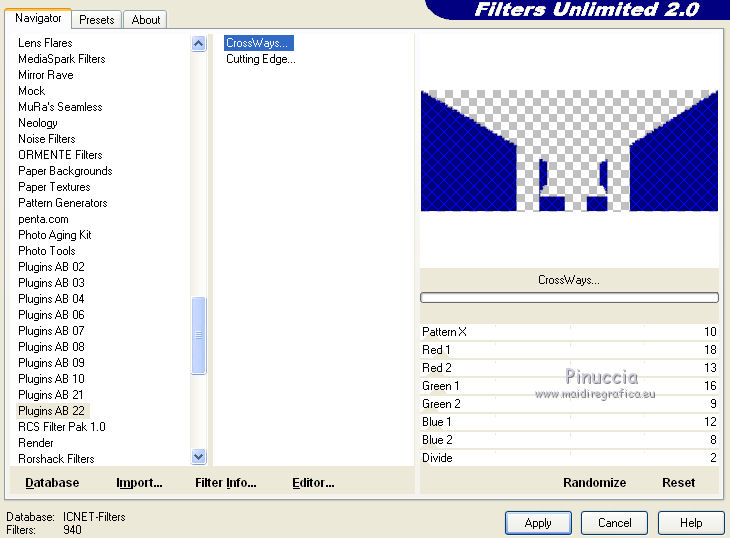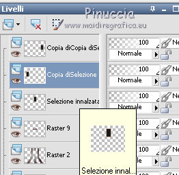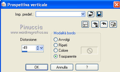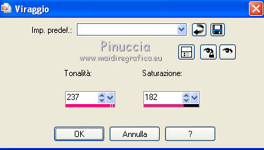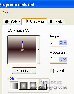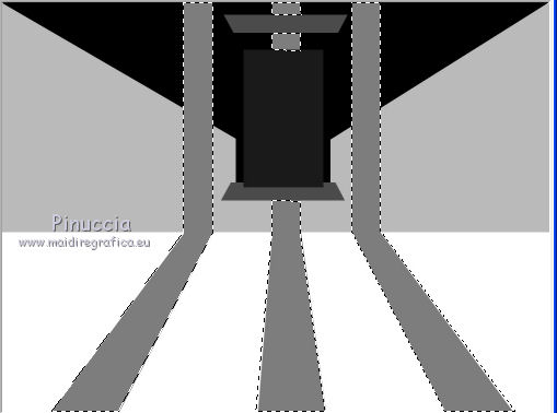Occorrente: Materiale qui Il materiale fa parte della collezione personale di Roserika. Per favore, lascia intatto il copyright. Filtri: Se hai problemi con i filtri, ricordati della mia sezione filtri qui Mura's Meister - Perspective Tiling qui Alien Skin Eye Candy 5 Impact qui Filters Unlimited 2.0 qui Bkg Designer sf10I qui Plugins AB 22 qui VanDerLee - Unplugged X qui Metti il preset "suranianextrude" nella cartella del filtro Alien Skin Eye Candy 5 Impact>Settings>Extrude. Doppio clic sul file e il preset sarà automaticamente installato. Se preferisci puoi importarlo, quando ti servirà, dalla cartella in cui hai scompattato il materiale. Vedi la scheda del filtro qui e come importare un preset in Eye Candy qui Metti il gradiente nella cartella Gradienti. Metti la selezione nella cartella Selezioni. 1. Passa il colore di primo piano a Gradiente e seleziona il gradiente ES Vintage 35 con i seguenti settaggi. ![]() Imposta il colore di sfondo con #0000ff. Apri una nuova immagine trasparente 1000 x 750 pixels. Selezione>Seleziona tutto. Apri "fondformes" e vai a Modifica>Copia. Torna al tuo lavoro e vai a Modifica>Incolla nella selezione. Selezione>Deseleziona. Attiva lo strumento bacchetta magica con i seguenti settaggi:attenzione "contiguo" non selezionato ![]() clicca nella parte grigia per selezionarla, avendo deselezionato "contiguo" basterà un solo clic. ![]() attenzione, continuerò il tutorial, traducendo i passaggi del tutorial originale. Ma ti segnalo che per il mio esempio, per non vedere le antiestetiche frastagliature della selezione, ho continuato selezionando gli spazi con lo strumento Selezione a mano libera ![]() Per questo motivo e - nel caso volessi seguire il mio esempio - a causa delle possibili differenze delle aree selezionate, il tuo risultato potrà essere diverso dal mio. Questa la mia selezione con il lazo. ![]() Premi sulla tastiera il tasto CANC. Livelli>Nuovo livello raster. Riempi con il gradiente.Selezione>Deseleziona. Effetti>Plugins>VanDerLee - Unplugged X - Defocus con i seguenti settaggi. ![]() 2. Attiva nuovamente il livello inferiore. Seleziona la parte grigia ai lati e al centro con la bacchetta magica ![]() con i precedenti settaggi. ![]() Premi sulla tastiera il tasto CANC. Livelli>Nuovo livello raster. Riempi con il colore di sfondo.Effetti>Plugins>Filters Unlimited 2.0 - Plugins AB 22 - Cross ways, con i settaggi standard. ![]() Ripeti l'Effetto una seconda volta. Livelli>Duplica. Effetti>Plugins>Filters Unlimited 2.0 - Bkg Designer sf10I - Cruncher, con i settaggi standard. ![]() Selezione>Deseleziona. Cambia la modalità di miscelatura di questo livello in Luminanza. Cambia la modalità di miscelatura del livello sottostante in Filtra. Attiva nuovamente il livello inferiore. Seleziona la parte nera in alto con la bacchetta magica ![]() ![]() Premi sulla tastiera il tasto CANC. Livelli>Nuovo livello raster. Riempi con il gradiente.Regola>Sfocatura>Sfocatura gaussiana - raggio 92. ![]() Effetti>Plugins>Filters Unlimited 2.0 - BKG Designer sf10I - Cut Glass 02, con i settaggi standard. ![]() Selezione>Deseleziona. 3. Attiva ancora una volta il livello inferiore. Seleziona la parte bianca in basso con la bacchetta magica ![]() Premi sulla tastiera il tasto CANC. Livelli>Nuovo livello raster. Riempi con il gradiente.Regola>Sfocatura>Sfocatura gaussiana - raggio 92. ![]() Selezione>Deseleziona. Regola>Aggiungi/Rimuovi disturbo>Aggiungi disturbo. ![]() Livelli>Nuovo livello raster. Livelli>Disponi>Porta sotto. Riempi con il gradiente.Effetti>Plugins>VanDerLee - Unplugged X - Finish Flag, con i seguenti settaggi. ![]() Effetti>Plugins>Mura's Meister - Perspective Tiling. ![]() Cambia la modalità di miscelatura di questo livello in Sovrapponi (per il momento non vedrai il risultato di questo cambio di miscelatura). ![]() 4. Livelli>Nuovo livello raster. Livelli>Disponi>Porta sotto. Riempi con il gradiente.Livelli>Nuovo livello raster. Cambia i settaggi del gradiente. ![]() Riempi con il nuovo gradiente.Effetti>Effetti geometrici>Prospettiva verticale. ![]() Regola>Tonalità e saturazione>Viraggio. ![]() Cambia la modalità di miscelatura di questo livello in Sovrapponi. Questa dovrebbe essere la tua paletta dei livelli. ![]() Attiva il livello superiore. ![]() Selezione>Carica/Salva selezione>Carica selezione da disco. Cerca e carica la selezione suranian. ![]() Livelli>Nuovo livello raster. Riporta il Gradiente ai settaggi iniziali. ![]() Riempi la selezione con il gradiente.Effetti>Plugins>Alien Skin Eye Candy 5 Impact - Extrude. Seleziona il preset suranianextrude e ok. ![]() Selezione>Deseleziona. Effetti>Effetti 3D>Sfalsa ombra, con il colore nero. ![]() 5. Attiva il livello Raster 2. ![]() Effetti>Effetti 3D>Sfalsa ombra, con i settaggi precedenti. Attiva il livello Raster 1. Selezione personalizzata ![]() ![]() Selezione>Innalza selezione a livello. Livelli>Disponi>Porta in alto. Effetti>Plugins>Filters Unlimited 2.0 - Frames,Marble and Crystal - Crystal 10. ![]() Selezione>Deseleziona. Livelli>Duplica. Effetti>Effetti di immagine>Scostamento. ![]() Livelli>Duplica. Immagine>Rifletti. E adesso abbiamo tre cornici. Attiva il livello sottostante della cornice sinistra. ![]() Attiva lo strumento Bacchetta magica ![]() ![]() e clicca all'interno della cornice per selezionarla. Apri l'immagine "portrait1" e vai a Modifica>Copia. Torna al tuo lavoro e vai a Modifica>Incolla nella selezione. Selezione>Deseleziona. Effetti>Effetti 3D>Sfalsa ombra, con il colore nero. ![]() Attiva il livello della cornice di destra. Clicca all'interno della cornice con la bacchetta magica ![]() Modifica>Incolla nella selezione (l'immagine portrait1 è ancora in memoria). Selezione>Deseleziona. Effetti>Effetti 3D>Sfalsa ombra, con i settaggi precedenti. 6. Attiva il livello della cornice al centro, e seleziona l'interno con la bacchetta magica ![]() Apri l'immagine "portrait2" e vai a Modifica>Copia. Torna al tuo lavoro e vai a Modifica>Incolla nella selezione. Selez