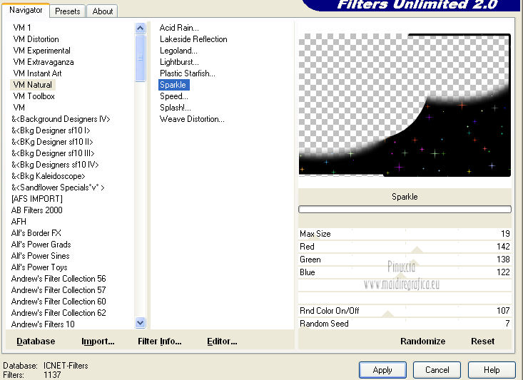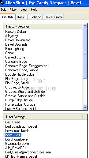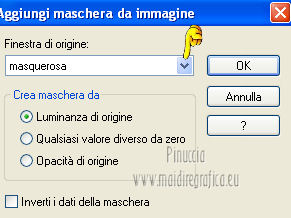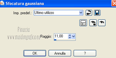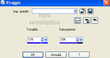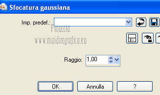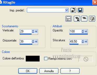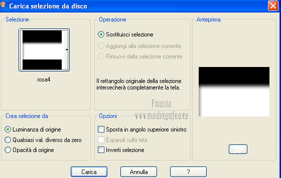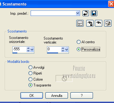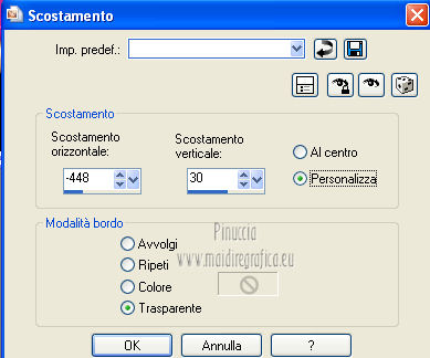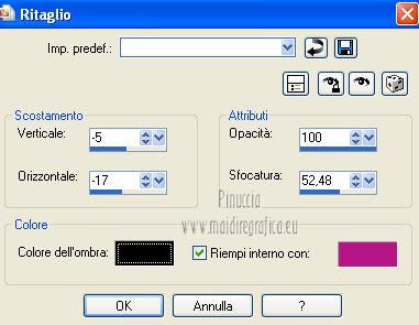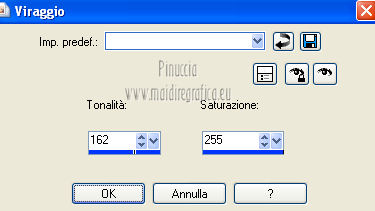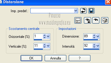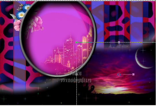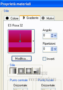 Occorrente: Materiale qui Il materiale fa parte della collezione personale di Roserika, tranne un paesaggio che appartiene a Gini che ringrazio per l'autorizzazione ad utilizzarlo. Per favore, lascia intatto il copyright. Filtri: Se hai problemi con i filtri, ricordati della mia sezione filtri qui Simple qui Filters Unlimited 2.0 qui VM Natural qui Alien Skin Eye Candy 5 Impact qui i filtri VM Natural si possono usare da soli o importati in Filters Unlimited 2.0 Metti il preset rosa nella cartella del filtro. Con un doppio clic sul file il preset sarà automaticamente installato nella cartella corretta. Metti il gradiente nella cartella Gradienti. Metti le selezioni nella cartella Selezioni. Apri la maschera in PSP e minimizzala con il resto del materiale. 1. Apri una nuova immagine trasparente 900 x 600 pixels. Passa il colore di primo piano a Gradiente, e seleziona il gradiente ES Rosa 32, con i seguenti settaggi. ![]() Riempi l'immagine trasparente con il gradiente.Livelli>Nuovo livello maschera>Da immagine. Apri il menu sotto la finestra di origine e vedrai la lista dei files aperti. Seleziona la maschera "masquerosa", con i seguenti settaggi. ![]() Livelli>Unisci>Unisci gruppo. Cambia la modalità di miscelatura di questo livello in Differenza. 2. Livelli>Nuovo livello raster. Riempi con il gradiente.Livelli>Disponi>Porta sotto. Regola>Tonalità e saturazione>Viraggio. ![]() Livelli>Nuovo livello raster. Riempi ancora con il gradiente.Immagine>Ruota per gradi - 90 gradi a sinistra. ![]() Effetti>Plugins>Simple - Zoom out and flip. Modifica>Ripeti Zoom out and flip. Effetti>Effetti 3D>Sfalsa ombra, con il colore nero. ![]() Livelli>Unisci>Unisci visibile. 3. Selezione>Carica/Salva selezione>Carica selezione da disco. Cerca e carica la selezione rosa. ![]() Livelli>Nuovo livello raster. Riempi con il colore #c0c0c0.Effetti>Plugins>Alien Skin Eye Candy 5 Impact - Bevel, seleziona il preset bevelshell e ok. ![]() Selezione>Deseleziona. Regola>Sfocatura>Sfocatura gaussiana - raggio 1. ![]() Effetti>Plugins>Alien Skin Eye Candy 5 Impact - Glass. Seleziona il preset Clear e ok. ![]() Regla>Colore>Correzione scolorimento. ![]() 4. Attiva il livello inferiore. Selezione>Carica/Salva selezione>Carica selezione da disco. Cerca e carica la selezione rosa2. ![]() Selezione>Innalza selezione a livello. Effetti>Effetti di distorsione>Distorsione. ![]() Livelli>Nuovo livello raster. Effetti>Effetti 3D>Ritaglio, colore riempimento #b61688. ![]() Livelli>Nuovo livello raster. Effetti>Effetti 3D>Ritaglio. ![]() Selezione>Deseleziona. Attiva il livello sottostante, e cambia la modalità di miscelatura del livello sottostante in Filtra. Rimani posizionato su questo livello. 5. Apri il tube jd-flower3 e vai a Modifica>Copia. Torna al tuo lavoro e vai a Modifica>Incolla come nuovo livello. Livelli>Disponi>Sposta giù. Spostalo in alto a sinistra, al di fuori del cerchio.![]() Apri il tube citysLights_MistedByGini_02-15-06 e vai a Modifica>Copia. Torna al tuo lavoro e vai a Modifica>Incolla come nuovo livello. Spostalo in basso a destra.Vedi l'esempio finale. ![]() 6. Rimani su questo livello. Selezione>Carica/Salva selezione>Carica selezione da disco. Cerca e carica la selezione rosa3. ![]() Livelli>Nuovo livello raster. Riempi con il colore nero.Selezione>Deseleziona. Effetti>Plugins>Filters Unlimited 2.0 - VM Natural - Sparkle. ![]() Apri il tube paysagecoucherdesoleil e vai a Modifica>Copia. Torna al tuo lavoro e vai a Modifica>Incolla come nuovo livello. Spostalo in basso a destra.![]() Questa dovrebbe essere la tua paletta dei livelli. ![]() 7. Livelli>Unisci>Unisci visibile. Apri il tube femmerosa e vai a Modifica>Copia. Torna al tuo lavoro e vai a Modifica>Incolla come nuovo livello. Spostalo in basso a sinistra.Fai attenzione, all'ombra, che deve toccare il bordo e non restare "sospesa". ![]() Apri il tube étiquette e vai a Modifica>Copia. Torna al tuo lavoro e vai a Modifica>Incolla come nuovo livello. Spostalo sul cerchio a destra, come nel mio esempio.Immagine>Aggiungi bordatura, 20 pixels, simmetriche, con il colore nero. Modifica>Copia. Immagine>Aggiungi bordatura, 40 pixels, simmetriche, con un colore contrastante. Seleziona questo bordo con la bacchetta magica ![]() Modifica>Incolla nella selezione. Regola>Sfocatura>Sfocatura gaussiana - raggio 11. ![]() Livelli>Nuovo livello raster. Riempi con il gradiente.Selezione>Deseleziona. Cambia la modalità di miscelatura di questo livello in Indebolisci. 8. Livelli>Duplica. Immagine>Ruota per gradi - 90 gradi a sinistra. ![]() Abbassa l'opacità di questo livello al 30%. Livelli>Duplica. Effetti>Effetti di immagine>Scostamento. ![]() Selezione>Carica/Salva selezione>Carica selezione da disco. Cerca e carica la selezione rosa4. ![]() Premi sulla tastiera il tasto CANC. Selezione>Deseleziona. Regola>Tonalità e saturazione>Viraggio. ![]() Livelli>Duplica. Effetti>Effetti di immagine>Scostamento. ![]() 9. Livelli>Duplica. Immagine>Capovolgi. Immagine>Ruota per gradi - 90 gradi a sinistra. Effetti>Effetti di immagine>Scostamento. ![]() Selezione>Carica/Salva selezione>Carica selezione da disco. Carica nuovamente la selezione rosa4. ![]() Premi sulla tastiera il tasto CANC. Selezione>Deseleziona. 10. Livelli>Duplica. Immagine>Rifletti. Effetti>Effetti di immagine>Scostamento. ![]() Livelli>Duplica. Immagine>Rifletti. 11. Livelli>Unisci>Unisci tutto. Immagine>Ridimensiona, al 95%, tutti i livelli selezionato. Firma il tuo lavoro ed esporta come jpg ottimizzata, compressione 20. ![]() ![]() Se hai problemi o dubbi, o trovi un link non funzionante, o anche soltanto per un saluto, scrivimi. |