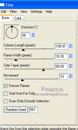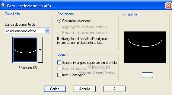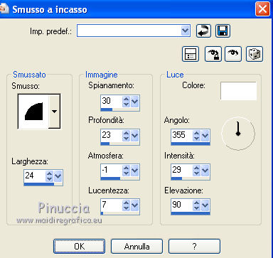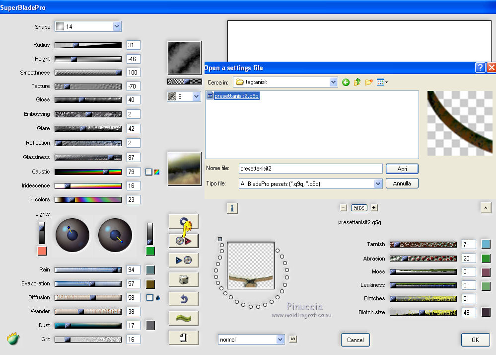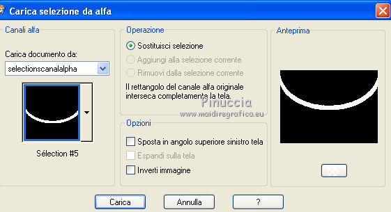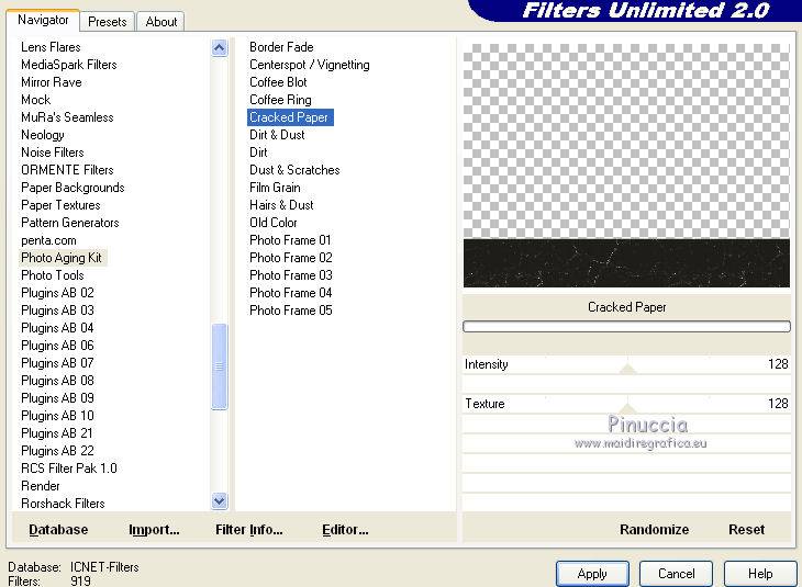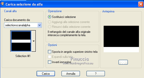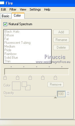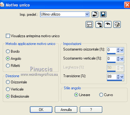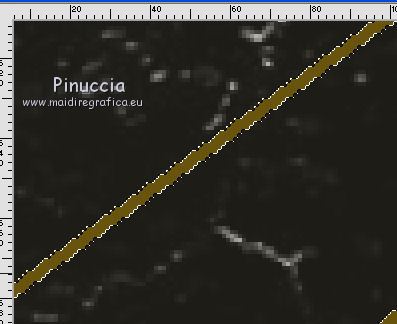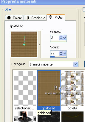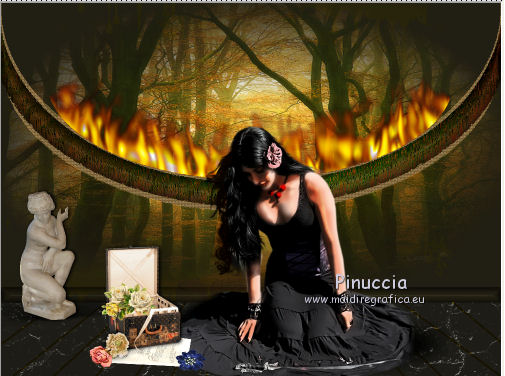 Occorrente: Materiale qui Il materiale fa parte della collezione personale di Roserika. Per favore, lascia intatto il copyright. Filtri: Se hai problemi con i filtri, ricordati della mia sezione filtri qui Eye Candy 4000 qui Filters Unlimited 2.0 qui Photo Aging Kit qui Flaming Pear - Superblade Pro qui Metti il preset "presettanisit2" nella cartella del filtro Superblade Pro. Se preferisci, puoi importarlo direttamente, quando ti servirà, dalla cartella in cui hai salvato il materiale. Apri il file "sele4ctionscanalalpha" in PSP e minimizzalo. L'immagine non è vuota ma contiene le selezioni salvate sul canale alfa. Con il file minimizzato, le selezioni saranno disponibili quando ti serviranno. Apri la maschera "masquetanisit" e il motivo goldbead in PSP, e minimizzali con il resto del materiale. 1. Apri una nuova immagine trasparente 1000 x 750 pixels. Imposta il colore di primo piano con #68540d, e il colore di sfondo con #1e1d18. Riempi l'immagine trasparente con il colore di sfondo.Livelli>Nuovo livello raster. Riempi con il colore di primo piano.Livelli>Nuovo livello maschera>Da immagine. Apri il menu sotto la finestra di origine e vedrai la lista dei files aperti. Tra questi la maschera. Seleziona la maschera "masquetanisit" con i seguenti settaggi: ![]() Livelli>Unisci>Unisci gruppo. Effetti>Effetti di immagine>Motivo unico. ![]() Cambia la modalità di miscelatura di questo livello in Saturazione. 2. Livelli>Unisci>Unisci visibile. Selezione>Carica/Salva selezione>Carica selezione da canale alfa. La selezione "selection#1" è subito disponibile. Devi soltanto cliccare Carica. ![]() Livelli>Nuovo livello raster. Riempi con il colore di sfondo.Selezione>Deseleziona. Effetti>Plugins>Filters Unlimited 2.0 - Photo Aging Kit - Cracked Paper. ![]() Selezione>Carica/Salva selezione>Carica selezione da canale alfa. Apri il menu delle selezioni e carica "selection#2". ![]() Livelli>Nuovo livello raster. Riempi con il colore di primo piano.Ingrandisci l'immagine per visualizzare meglio lo spazio da riempire. ![]() Selezione>Deseleziona. Cambia la modalità di miscelatura di questo livello in Luce netta. 3. Attiva il livello inferiore. Modifica>Copia. Attiva il livello superiore. Livelli>Nuovo livello raster. Selezione>Carica/Salva selezione>Carica selezione da canale alfa. Carica "selection#3". ![]() Modifica>Incolla nella selezione. Selezione>Deseleziona. Selezione>Carica/Salva selezione>Carica selezione da canale alfa. Carica "selection#4". ![]() Senza aggiungere un nuovo livello: Effetti>Effetti 3D>Smusso a incasso. ![]() Selezione>Deseleziona. Selezione>Carica/Salva selezione>Carica selezione da canale alfa. Carica "selection#5". ![]() Livelli>Nuovo livello raster. Riempi con il colore di primo piano.Effetti>Plugins>Flaming Pear - Superblad Pro. clicca sull'icona indicata dalla manina, e cerca il preset "presettanisit" nella cartella in cui lo hai salvato. ![]() Effetti>Effetti 3D>Smusso a incasso, con i settaggi precedenti. Selezione>Deseleziona. 4. Passa il colore di primo piano a Motivi. Apri il menu e seleziona - tra le Immagini aperte - il motivo goldbead, con i seguenti settaggi. ![]() Selezione>Carica/Salva selezione>Carica selezione da canale alfa. Carica "selection#6". ![]() Livelli>Nuovo livello raster. Riempi con il motivo oro.Selezione>Deseleziona. Livelli>Disponi>Sposta giù. Attiva nuovamente il livello superiore. Selezione>Carica/Salva selezione>Carica selezione da canale alfa. Carica "selection#7". ![]() Livelli>Nuovo livello raster. Apri il tube "paysage" e vai a Modifica>Copia. Torna al tuo lavoro e vai a Modifica>Incolla nella selezione. Selezione>Deseleziona. Livelli>Unisci>Unisci visibile. 5. Selezione>Carica/Salva selezione>Carica selezione da canale alfa. Carica "selection#8". ![]() Livelli>Nuovo livello raster. Effetti>Plugins>Eye Candy 4000 - Fire. Sotto la linguetta Color è selezionato Natural spectrum. ![]() Selezione>Deseleziona. Effetti>Effetti di immagine>Scostamento. ![]() Livelli>Unisci>Unisci visibile. Apri il tube "femmeassise" e vai a Modifica>Copia. Torna al tuo lavoro e vai a Modifica>Incolla come nuovo livello. Spostalo in basso al centro.Apri il tube "objets". Copia e incolla sul tuo lavoro i due livelli di cui è composto, e disponi gli oggetti come nell'esempio.![]() Apri il tube "pétalesrose" e vai a Modifica>Copia. Torna al tuo lavoro e vai a Modifica>Incolla come nuovo livello. Spostalo in basso a destra.Immagine>Aggungi bordatura, 20 pixels, simmetriche, con il colore nero. Firma il tuo lavoro ed esporta come jpg ottimizzata, compressione 20. ![]() ![]() Se hai problemi o dubbi, o trovi un link non funzionante, o anche soltanto per un saluto, scrivimi. |