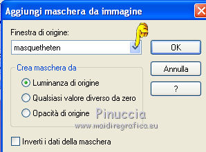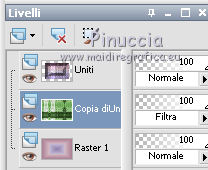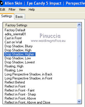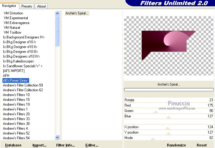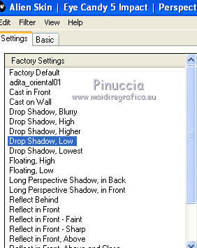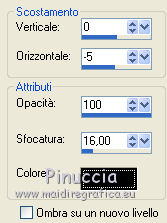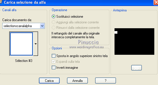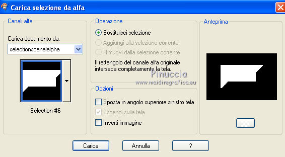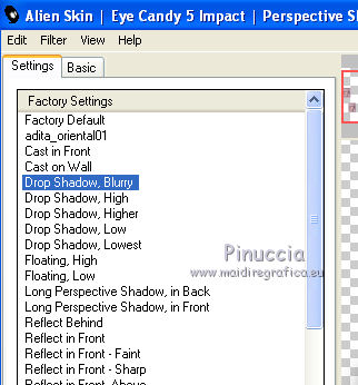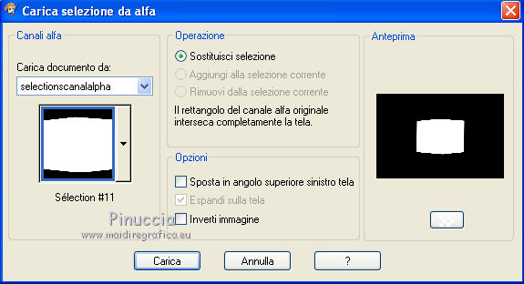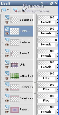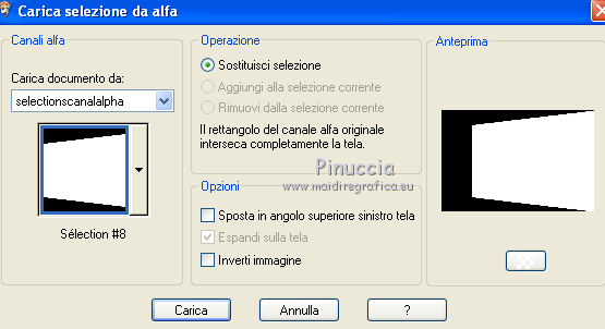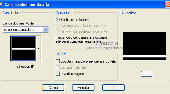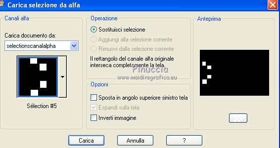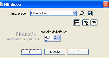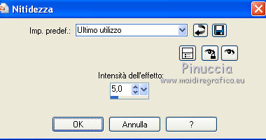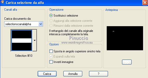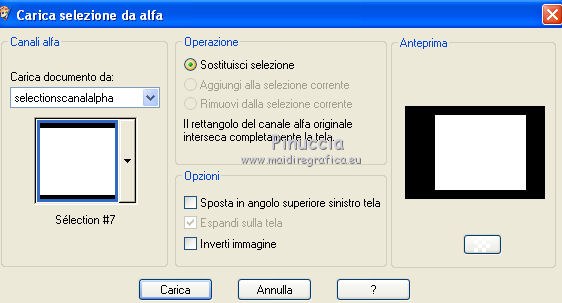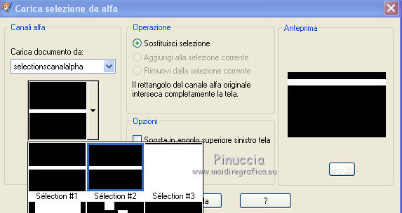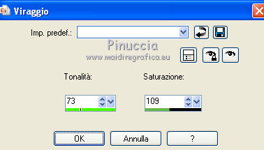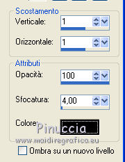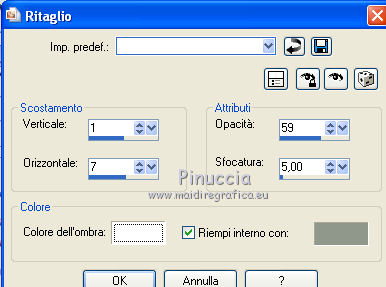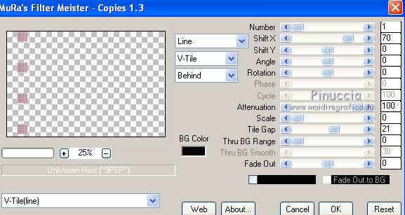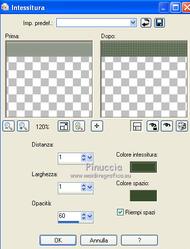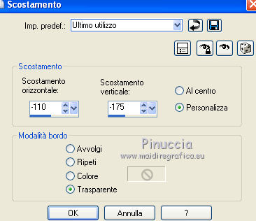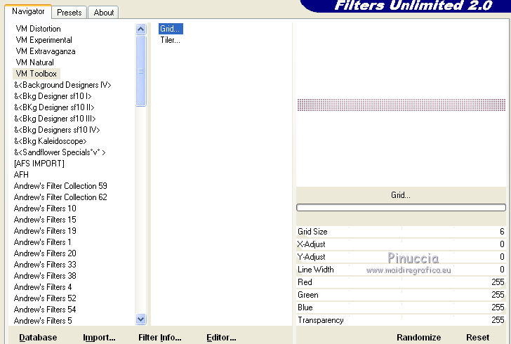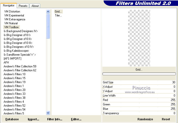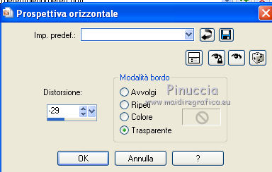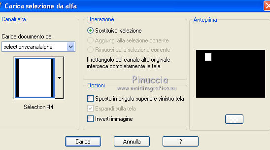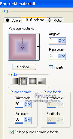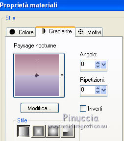segno. Occorrente: Materiale qui Tutto il materiale fa parte della collezione personale di Roserika. Per favore, lascia intatto il copyright. Filtri: Se hai problemi con i filtri, ricordati della mia sezione filtri qui Filters Unlimited 2.0 qui VM Toolbox qui Simple qui Alien Skin Eye Candy 5 Impact qui Alf's Power Sines qui Mura's Meister - Copies qui Metti il gradiente nella cartella Gradienti. Apri "sélectionscanalalpha" e minimizzala. L'immagine non è vuota, ma contiene le selezioni salvate sul canale alpha. Con il file minimizzalo, le selezioni saranno disponibili quando ti serviranno. Apri la maschera masquetheten in PSP e minimizzala con il resto del materiale. 1. Passa il colore di primo piano a Gradiente, seleziona il gradiente Paysage nocturne con i seguenti settaggi. ![]() Apri una nuova immagine trasparente 900 x 600 pixels, e riempila con il gradiente.Livelli>Duplica. Livelli>Nuovo livello maschera. Apri il menu sotto la finestra di origine e vedrai la lista dei files aperti. Seleziona la maschera masquetheten con i seguenti settaggi. ![]() Livelli>Unisci>Unisci gruppo. Cambia la modalità di miscelatura di questo livello in Differenza. Livelli>Duplica. Effetti>Plugins>Simple - Centre tile. Cambia la modalità di miscelatura di questo livello in Indebolisci. Immagine>Ruota per gradi - 90 gradi a destra. ![]() 2. Livelli>Unisci>Unisci visibile. Immagine>Ridimensiona, all'80%, tutti i livelli non selezionato. Livelli>Duplica. Effetti>Plugins>Simple - Centre Tile. Livelli>Disponi>Porta sotto. Cambia la modalità di miscelatura di questo livello in Filtra. Regola>Tonalità e saturazione>Viraggio. ![]() (per il momento non vedrai l'effetto di questi passaggi). Livelli>Nuovo livello raster. Passa il gradiente a stile Rettangolare. ![]() Riempi il livello con il gradiente.Livelli>Disponi>Porta sotto. 3. Attiva il secondo livello dal basso, quello del punto precedente. ![]() Selezione>Carica/Salva selezione>Carica selezione da canale alpha. E' già presente la selezione "sélection#1". Devi soltanto cliccare Carica. ![]() Premi sulla tastiera il tasto CANC. Attiva il livello inferiore. Selezione>Innalza selezione a livello. Effetti>Plugins>Filters Unlimited - VM Toolbox - Grid: ![]() Selezione>Deseleziona. Cambia la modalità di miscelatura di questo livello in Filtra. 4. Attiva il livello soprastante (copia di Uniti). Selezione>Carica/Salva selezione>Carica selezione da canale alpha. Apri il menu delle selezioni, seleziona "sélection2" e Carica. ![]() Premi sulla tastiera il tasto CANC. Attiva il livello inferiore (Raster 1). Selezione>Innalza selezione a livello. Effetti>Plugins>Filters Unlimited - VM Toolbox - Grid, con i settaggi precedenti. Selezione>Deseleziona. Cambia la modalità di miscelatura di questo livello in Filtra. 5. Rimani su questo livello. Selezione>Carica/Salva selezione>Carica selezione da canale alpha. Seleziona e carica "sélection#3". ![]() Selezione>Innalza selezione a livello. Livelli>Nuovo livello raster. Riempi con il colore bianco.Selezione>Modifica>Contrai - 2 pixels. Premi sulla tastiera il tasto CANC. Selezione>Deseleziona. Livelli>Unisci>Unisci giù. Livelli>Disponi>Porta in alto. Effetti>Effetti di immagine>Scostamento. ![]() Effetti>Plugins>Mura's Meister - Copies. ![]() Effetti>Plugins>Alien Skin Eye Candy 5 Impact - Perspective Shadow seleziona il preset Drop Shadow, Low e ok. ![]() Regola>Tonalità e saturazione>Viraggio. ![]() 6. Attiva il livello superiore. Selezione>Carica/Salva selezione>Carica selezione da canale alpha. Seleziona e carica "sélection#4". ![]() Livelli>Nuovo livello raster. Riempi con il colore bianco.Selezione>Modifica>Contrai - 2 pixels. Riempi con il gradiente.Apri il tube "portraitcool" e vai a Modifica>Copia. Torna al tuo lavoro e vai a Modifica>Incolla nella selezione. Selezione>Deseleziona. Livelli>Disponi>Sposta giù. 7. Livelli>Duplica. Effetti>Effetti di immagine>Scostamento. ![]() Livelli>Duplica. Immagine>Ridimensiona, al 95%, tutti i livelli non selezionato. Effetti>Effetti di immagine>Scostamento. ![]() Livelli>Unisci>Unisci giù. Di nuovo Livelli>Unisci>Unisci giù. Effetti>Plugins>Alien Skin Eye Candy 5 Impact - Perspective Shadow. Seleziona il preset Drop Shadow, Blurry e ok. ![]() 8. Attiva nuovamente il livello superiore. Selezione>Carica/Salva selezione>Carica selezione da canale alpha. Seleziona e carica "sélection#5". ![]() Livelli>Nuovo livello raster. Riempi con il colore bianco.Selezione>Modifica>Contrai - 2 pixels. Premi sulla tastiera il tasto CANC. Livelli>Nuovo livello raster. Effetti>Plugins>Filters Unlimited 2.0 - VM Toolbox - Grid: ![]() Selezione>Deseleziona. Livelli>Disponi>Sposta giù. Ancora Livelli>Disponi>Sposta giù. Abbassa l'opacità di questo livello al 41%. Attiva nuovamente il livello superiore. Livelli>Disponi>Sposta giù. Questa dovrebbe essere la tua paletta dei livelli. ![]() 9. Attiva il livello superiore. Livelli>Unisci>Unisci giù. Ripeti 3 volte e avrai i quattro livelli superiori uniti in un unico livello. a volte con il comando "Livelli>Unisci>Unisci giù" le immagini sbiadiscono. Per evitare questo inconveniente, lascia visibili soltanto i quattro livelli superiori e vai a Livelli>Unisci>Unisci visibile, e riapri i livelli chiusi. Livelli>Duplica. Immagine>Rifletti. Immagine>Ridimensiona, al 70%, tutti i livelli non selezionato. Effetti>Effetti di immagine>Scostamento. ![]() Livelli>Unisci>Unisci giù. per il mio esempio, ho apportato una modifica perchè il risultato non era simile a quello del tutorial originale. In fondo al tutorial l'esempio con le istruzioni originali. Selezione>Carica/Salva selezione>Carica selezione da canale alpha. Seleziona e carica "sélection#6". ![]() Attiva il livello Uniti e premi sulla tastiera il tasto CANC. Attiva il livello Copia di Uniti e premi sulla tastiera il tasto CANC. Attiva il terzo livello dal basso. Livelli>Nuovo livello raster. Riempi la selezione con il gradiente.Selezione>Deseleziona. Effetti>Plugins>Alf's Power Sines