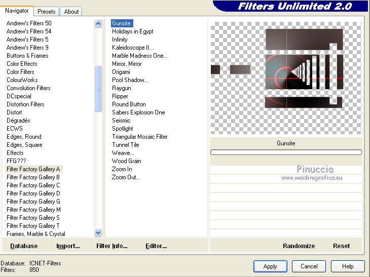 Effetti>Plugins>Filters Unlimited 2.0 - Factory Gallery A - Gunsite, con i settaggi standard.