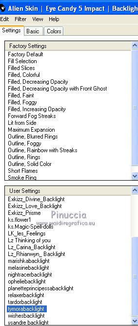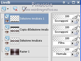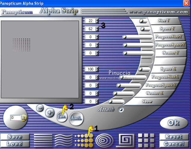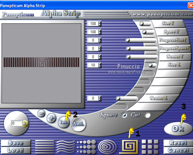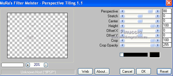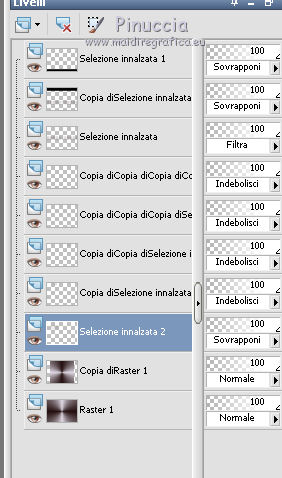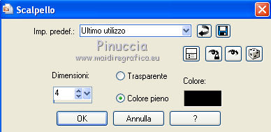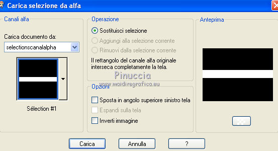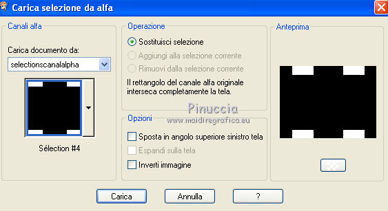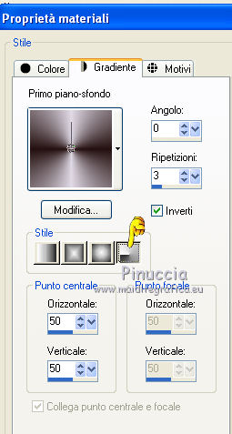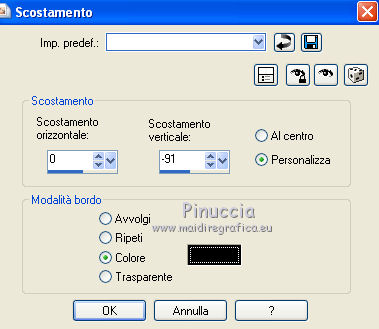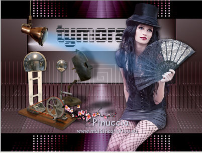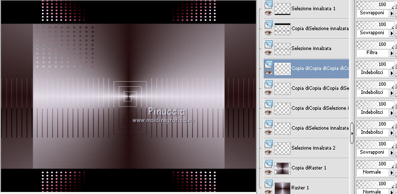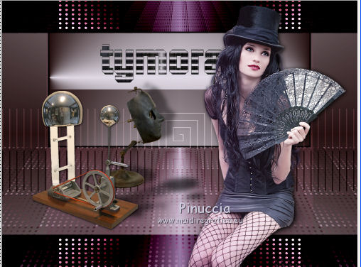 Occorrente: Materiale qui Il materiale fa parte della collezione personale di Roserika. Per favore, lascia intatto il copyright. Filtri: Se hai problemi con i filtri, ricordati della mia sezione filtri qui Panopticum - PAN Alpha Strip qui Mura's Meister - Perspective Tiling qui Simple - Half Wrap qui Alien Skin Eye Candy 5 Impact qui Metti il preset "tymorabackligh" nella cartella del filtro Alien Skin Eye Candy 5 Impact>Settings>Backlight. Doppio clic sul file e il preset sarà automaticamente installato. Se preferisci puoi importarlo, quando ti servirà, dalla cartella in cui hai scompattato il materiale. Vedi la scheda del filtro qui e come importare un preset in Eye Candy qui Apri selectionscanalalpha in PSP. L'immagine non è vuota, ma contiene le selezioni salvate sul canale alfa. Con il file minimizzato, avrai disponibili le selezioni quando ti serviranno. 1. Apri una nuova immagine trasparente 1000 x 750 pixels. Imposta il colore di primo piano con #241010, e il colore di sfondo con #e0dae6. Passa il colore di primo piano a Gradiente, stile Radiale, con i seguenti settaggi. ![]() Riempi l'immagine trasparente con il gradiente.Selezione>Carica/Salva selezione>Carica selezione da canale alfa. La "selection#1" è già disponibile. Devi soltanto cliccare Carica. ![]() Selezione>Innalza selezione a livello. Regola>Sfocatura>Sfocatura gaussiana - raggio 53. ![]() Effetti>Plugins>Panopticum - PAN Alpha Strip attenzione, l'icona Inverti deve essere deselezionata. ![]() Selezione>Deseleziona. Risultato (attenzione, le righe devono essere chiare; se non lo sono, significa che non hai selezionato correttamente Inverti). ![]() Cambia la modalità di miscelatura di questo livello in Filtra. 2. Livelli>Duplica. Immagine>Capovolgi. Effetti>Effetti di immagine>Scostamento - colore nero. ![]() Cambia la modalità di miscelatura di questo livello in Moltiplica. Attiva lo strumento Bacchetta magica ![]() e clicca nella parte nera per selezionarla. ![]() Selezione>Innalza selezione a livello. Selezione>Deseleziona. Immagine>Capovolgi. Cambia la modalità di miscelatura di questo livello in Sovrapponi. Cambia anche la modalità di miscelatura del livello sottostante in Sovrapponi. ![]() 3. Attiva il livello inferiore. Livelli>Duplica. Immagine>Ruota per gradi - 90 gradi a destra. ![]() Selezione>Carica/Salva selezione>Carica selezione da disco. Apri il menu delle selezioni e carica "selection#2". ![]() Selezione>Innalza selezione a livello. Effetti>Plugins>Panopticum - PAN Alpha Strip. ![]() Selezione>Deseleziona. Cambia la modalità di miscelatura di questo livello in Sovrapponi. Livelli>Duplica. Immagine>Ridimensiona, al 75%, tutti i livelli non selezionato. Effetti>Effetti di immagine>Scostamento. ![]() Cambia la modalità di miscelatura di questo livello in Indebolisci. Livelli>Duplica. Immagine>Rifletti. 4. Livelli>Duplica. Immagine>Capovolgi. Livelli>Duplica. Immagine>Rifletti. Dovresti avere questo. ![]() Attiva il terzo livello dal basso. ![]() Immagine>Ridimensiona, all'80%, tutti i livelli non selezionato. Effetti>Plugins>Mura's Meister - Perspective Tiling. Clicca su Reset per avere i settaggi standard e ok. ![]() Selezione>Carica/Salva selezione>Carica selezione da canale alfa. Carica "selection#3". ![]() Premi sulla tastiera il tasto CANC. Cambia la modalità di miscelatura di questo livello in Luce netta. 5. Attiva il secondo livello dal basso. Cambia la modalità di miscelatura di questo livello in Sovrapponi. ![]() Selezione>Carica/Salva selezione>Carica selezione da canale alfa. Carica "selection#4". ![]() Selezione>Innalza selezione a livello. Selezione>Deseleziona. Attiva nuovamente il livello sottostante. Selezione>Carica/Salva selezione>Carica selezione da canale alfa. Carica "selection#5". ![]() Selezione>Innalza selezione a livello. Effetti>Plugins>Simple - Half Wrap. Effetti>Effetti 3D>Scalpello - colore nero. ![]() Selezione>Deseleziona. 6. Livelli>Unisci>Unisci visibile. Apri il tube texte e vai a Modifica>Copia. Torna al tuo lavoro e vai a Modifica>Incolla come nuovo livello. Spostalo nel riquadro in alto al centro.Vedi l'esempio finale. Cambia la modalità di miscelatura di questo livello in Differenza. Apri il tube objets e copia il livello Raster 2. Torna al tuo lavoro e vai a Modifica>Incolla come nuovo livello. Spostalo al centro, come nel mio esempio.Copia il livello Raster 1 del tube objets. §Torna al tuo lavoro e vai a Modifica>Incolla come nuovo livello. Spostalo un po' più in basso a sinistra.Apri il tube femme e vai a Modifica>Copia. Torna al tuo lavoro e vai a Modifica>Incolla come nuovo livello. Spostalo in basso a destra.![]() 7. Apri il tube spot e vai a Modifica>Copia. Torna al tuo lavoro e vai a Modifica>Incolla come nuovo livello. Effetti>Effetti di immagine>Scostamento. ![]() Livelli>Nuovo livello raster. Selezione>Carica/Salva selezione>Carica selezione da canale alfa. Carica "selection#6". ![]() Effetti>Plugins>Alien Skin Eye Candy 5 Impact - Backlight. Seleziona il preset tymorabacklight e ok. ![]() Selezione>Deseleziona. 8. Apri il tube "brancheprunier" e vai a Modifica>Copia. Torna al tuo lavoro e vai a Modifica>Incolla come nuovo livello. Posiziona il tube come nel mio esempio.![]() Apri il tube "chat" e vai a Modifica>Copia. Torna al tuo lavoro e vai a Modifica>Incolla come nuovo livello. Spostalo a destra, accanto alla donna.Immagine>Aggungi bordatura, 20 pixels, simmetriche, con il colore nero. Firma il tuo lavoro ed esporta come jpg ottimizzata, compressione 20. ![]() ![]() Se hai problemi o dubbi, o trovi un link non funzionante, o anche soltanto per un saluto, scrivimi. |